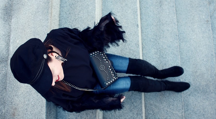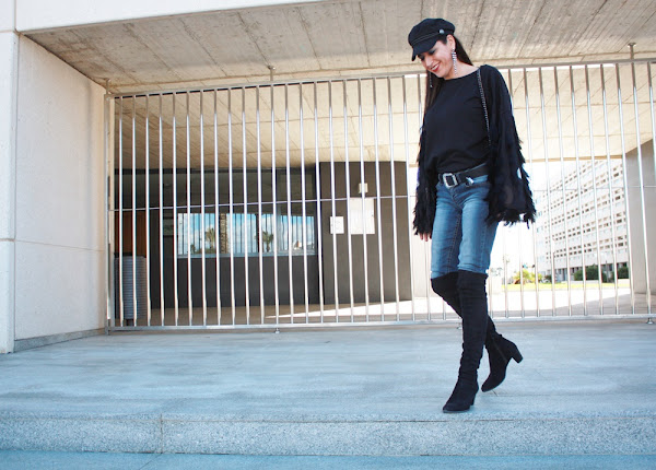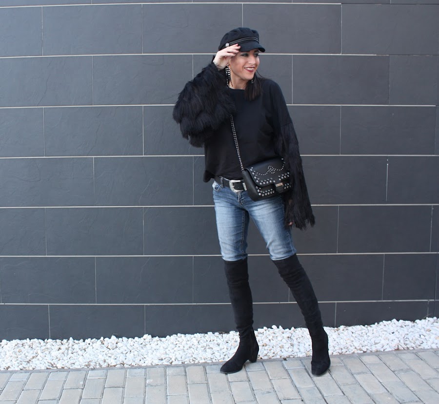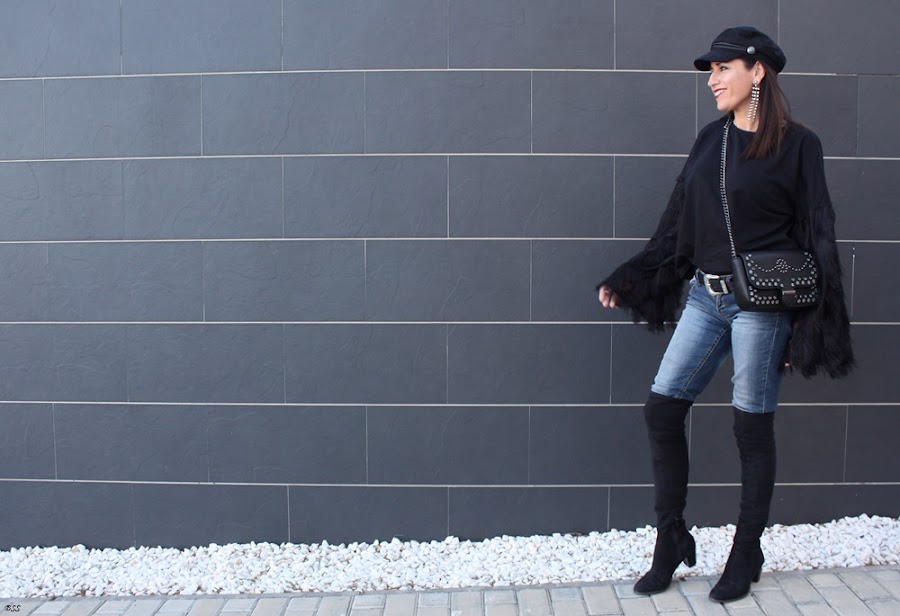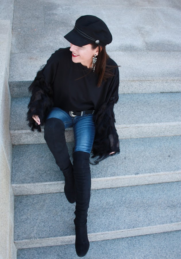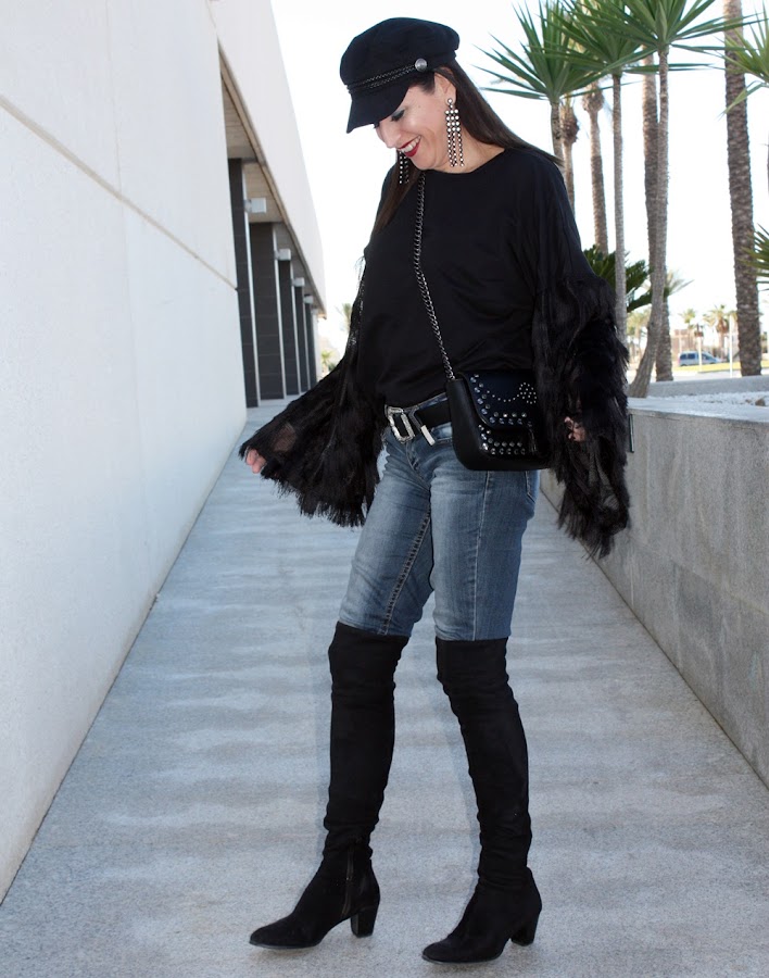 Hoy jeans, botas de caña alta y gorra acompañan a la protagonista del look.