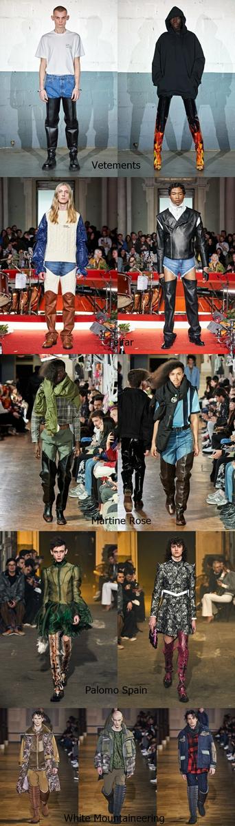 Un calzado muy femenino son las botas mosqueteras. Pues bien, la próxima temporada también los hombres lucirán sus botas altas. Una versión XXL, entre una bota mosquetera y una bota de pesca, en cuero, ajustadas e incluso fruncidas en algunos casos. También hay diseños de cowboy o botas de nylon muy anchas.Vetements, Telfar, Martine Rose, Palomo Spain, White Mountaineering apuestan por este estilo de botas altas.