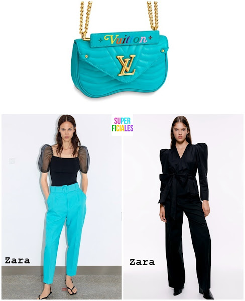 Bolso color turquesa de Louis Vuitton 1.490,00 € - Pantalón de vestir de Zara 29,95 € - Camisa manga abullonada de popelín de Zara 39,95 €