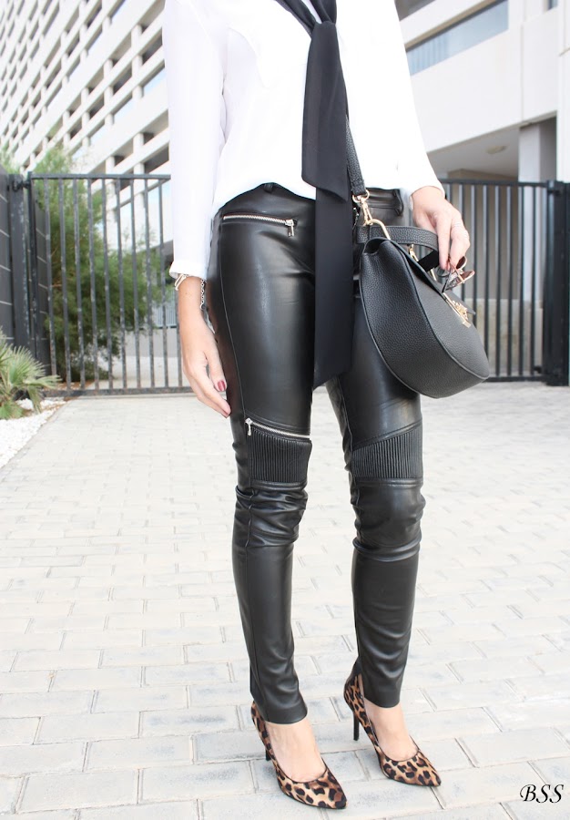 Esta vez a un look con pantalones de cuero y blusa holgada le he dado un toque distinto con un skinny scarve en color negro.