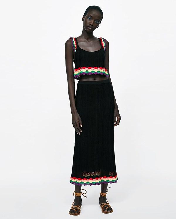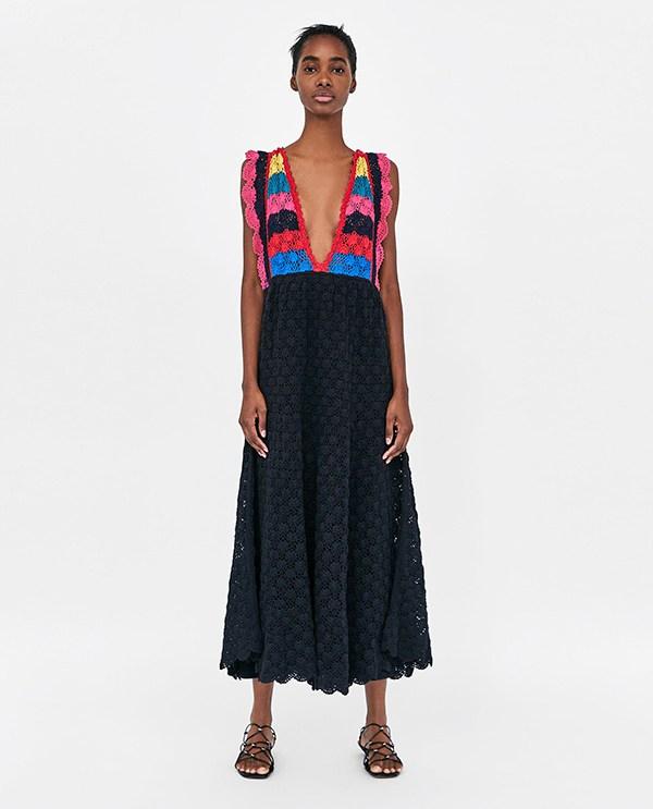 El crochet o el ganchillo de toda la vida es una tendencia que este verano esta pegando mas fuerte que nunca y he de decir que si nos limitamos a que tenga un detalle, como una pechera me puede llegar a gustar, este vestido largo es el perffecto ejemplo de hasta donde tolero el crochet, porque una prenda entera hecha con esta técnica me recuerda a una manta de abuela o una toquilla… a mi no me convence nada!Adema de colores muy vivos que para mi son demasiado… mas monocromatico aun lo puedo tolerar, pero esta ensalada de colores, no me gusta nada, demasiado hippy! pero como para gustos estan hechos los colores, creo que sin duda hay un público para todo y seguro que a muchas de vosotras os gusta esta tendencia! Además hay todo tipo de prendas, vestidos, jerseys, tops… faldas.