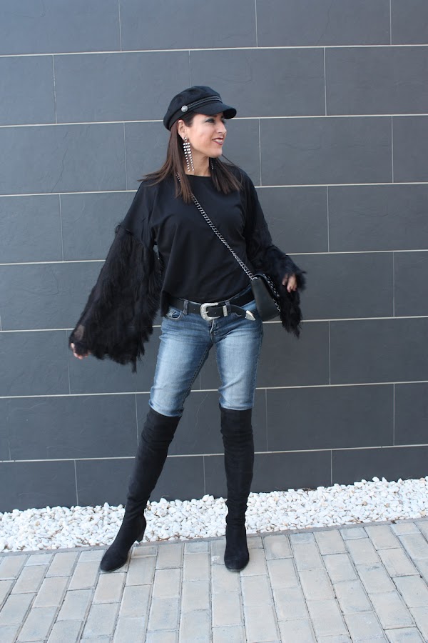 Hoy jeans, botas de caña alta y gorra acompañan a la protagonista del look.