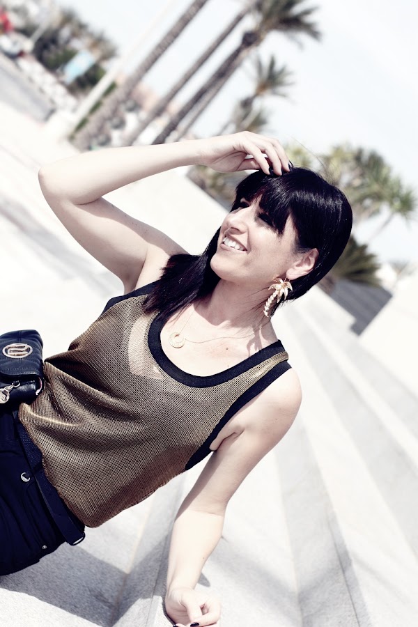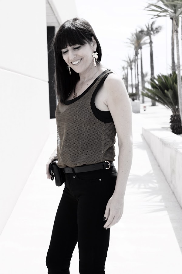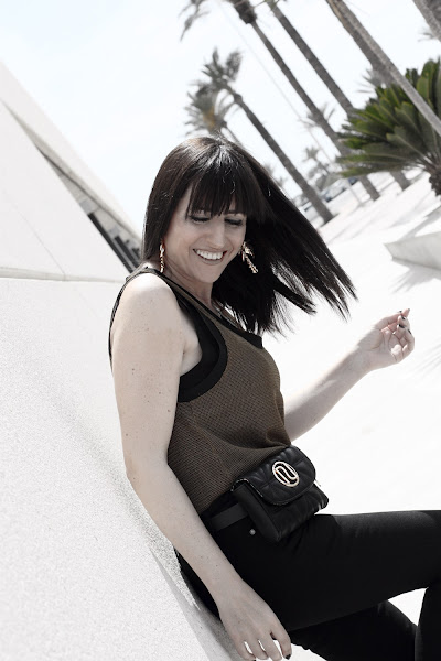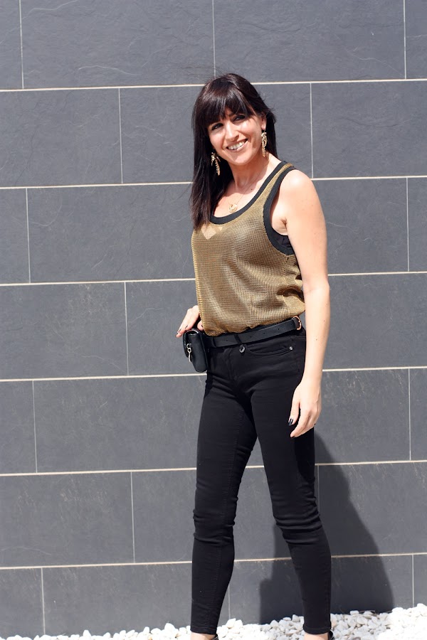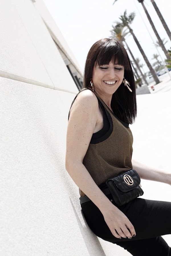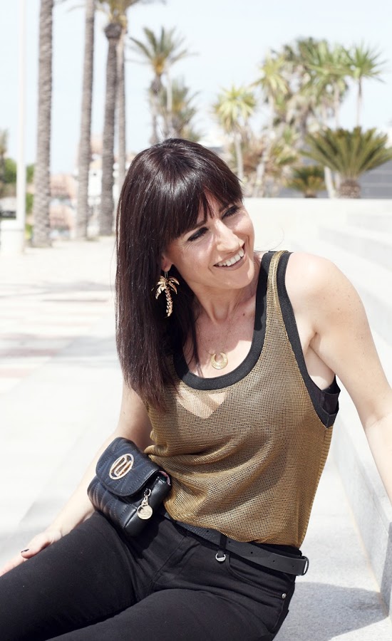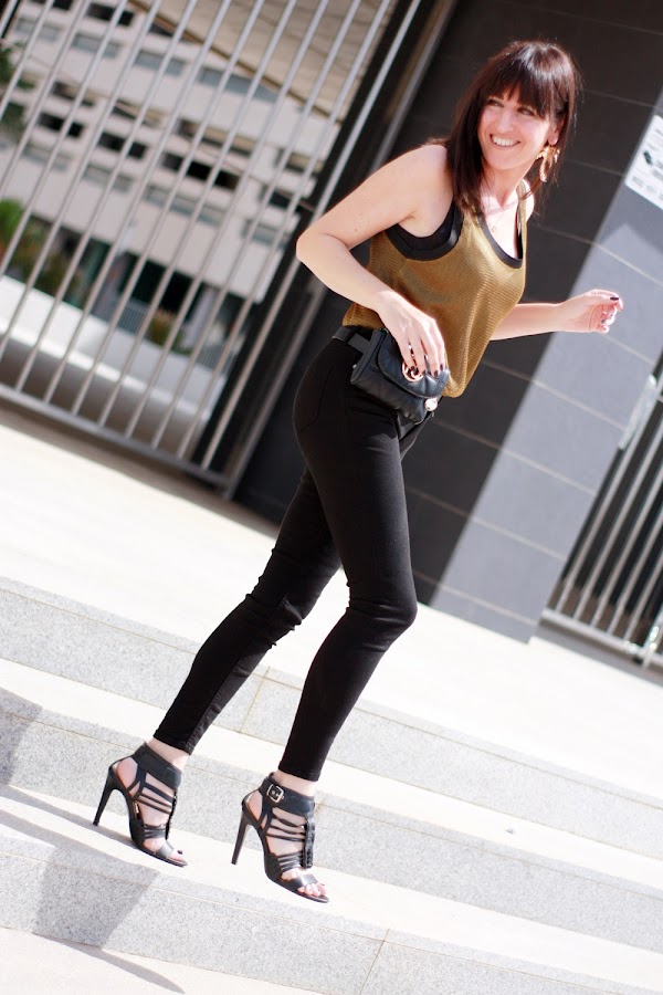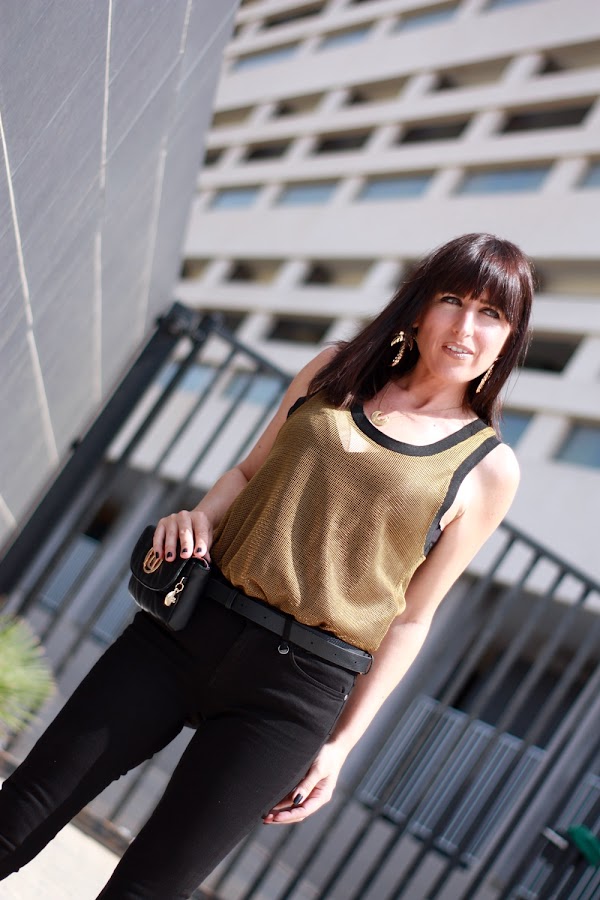 Hoy mi propuesta da ejemplo de ello, un jeans negro y un top semitransparente hacen un look muy atractivo donde la riñonera de vestir se convierte en una gran aliada.