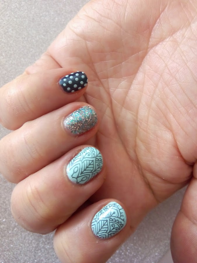 En esta ocasión he utilizado como base en la estampación el esmalte Breakfast in bed de Rimmel London y también dos de mis nuevas adquisiciones: para la base del dedo meñique he utilizado Laser 435 de Kiko y como glitter he utilizado Fancy top coat de Kiko.