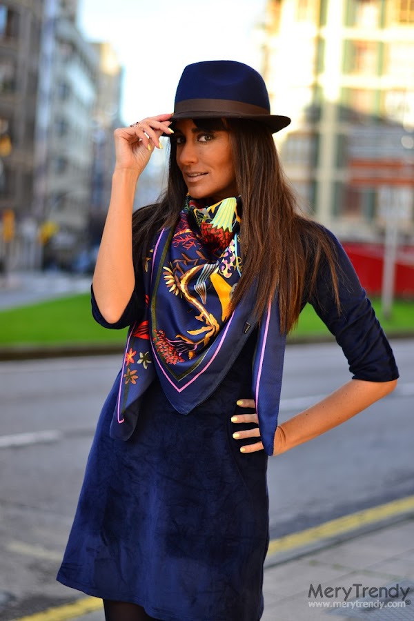 Ya sabéis que por estas fechas siempre suelo publicar algún post en el que os muestro una propuesta un tanto más festiva, pero a un precio asequible, como en este caso, en el que he querido enseñaros cómo con un sencillo vestidito de terciopelo en azul marino de Romwe, podemos crear un look de lo más sofisticado, simplemente añadiéndole un bonito complemento del tipo foulard o pañuelo, en vistosos colores, y lucirlo en una comida o cena navideña.