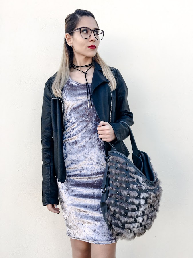 El protagonista de hoy es un vestido midi de terciopelo, de color gris y de escote asimétrico con solo una manga. Es súper cómodo y se adapta como un guante!