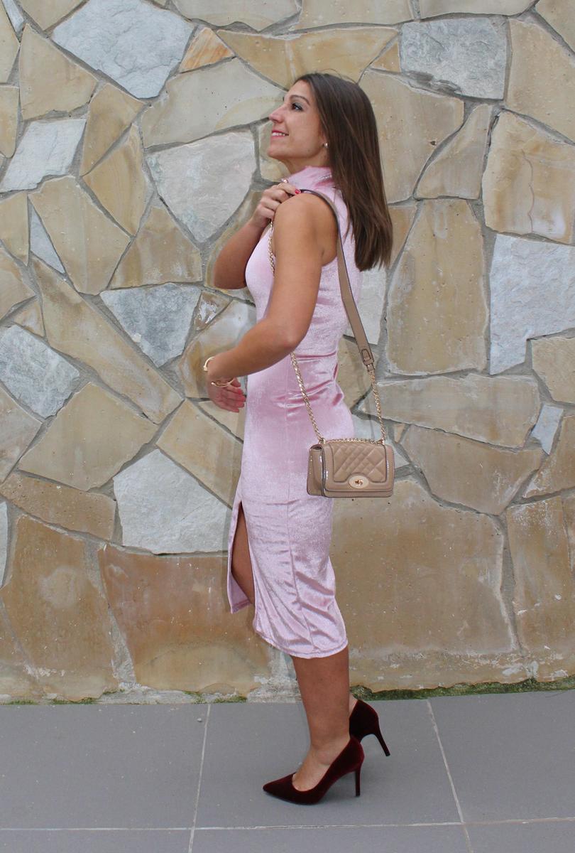 En mi look de hoy elegí total look de velvet, en primer lugar el vestido de ROMWE en un color rosa precioso, con un corte recto, cuello alto sin mangas y una bonita abertura en la parte delantera, que teniendo en cuenta la longitud del vestido es perfecto para poder caminar con naturalidad. En segundo lugar los salones en color granate del mismo tejido, que marcan el contraste del color claro del conjunto. Como complemento, un bolso color nude, sencillo y discreto, que cómo os comentaba arriba, no desvía el protagonismo del vestido.
