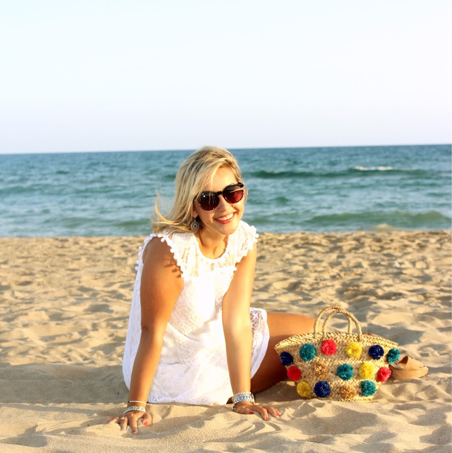 En el look que os enseño hoy, llevo un vestido blanco estilo boho que sin lugar a dudas es uno de mis favoritos. Lo combiné con mis sandalias de color camel que os he enseñado mil veces en el blog, pero es que son tan cómodas y combinan genial con todo, que se han convertido en mis zapatos favoritos de este verano. Y me puse mi bolso con pompones que creo que le iba como anillo al dedo a este look.