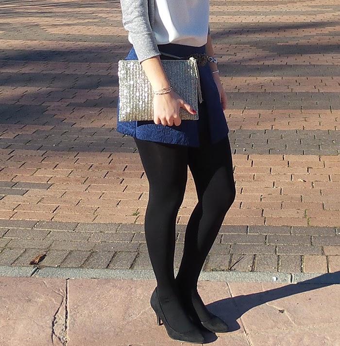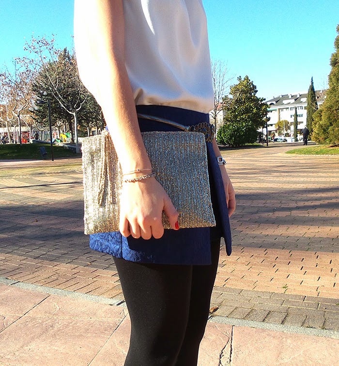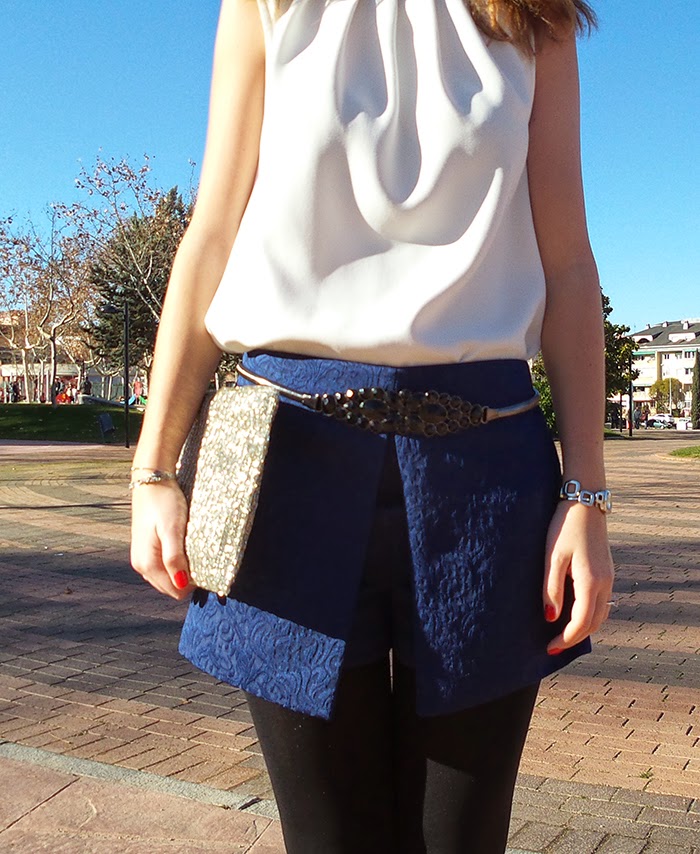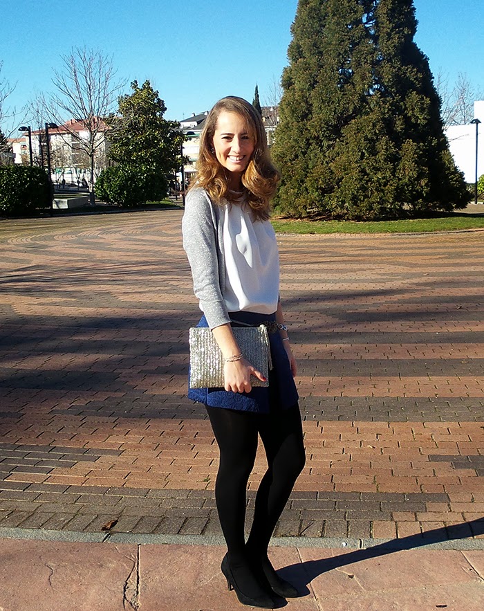 FELIZ NAVIDAD A TOD@S!Espero que hayáis pasado un par de días estupendos rodeados de vuestra familia y amigos.Hoy os enseño un conjunto más festivo, una buena opción para estos días de cenas y fiestas. La pieza clave es la falda pantalón de tela en azul y esta ocasión la he mezclado con tonos blanco, plata y negro.