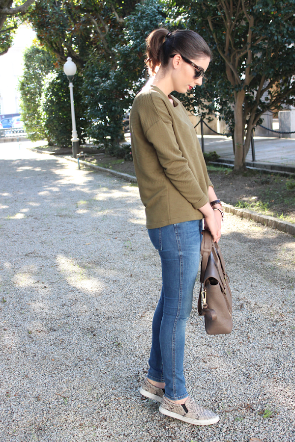 About the outfit as you can see very appropriate for autumn, with this green shade that it looks like it"s going to be the colour of the season.