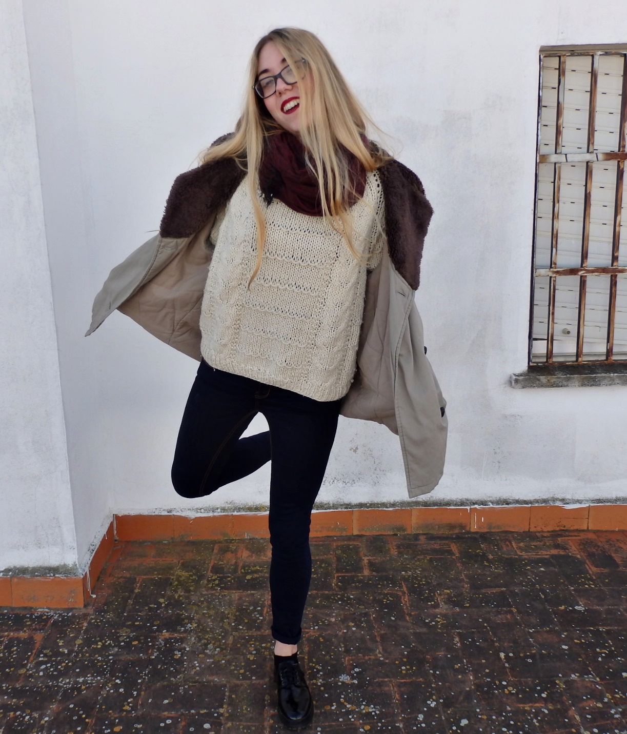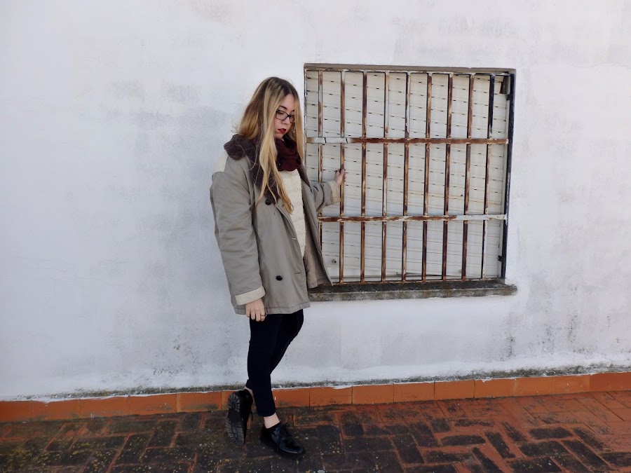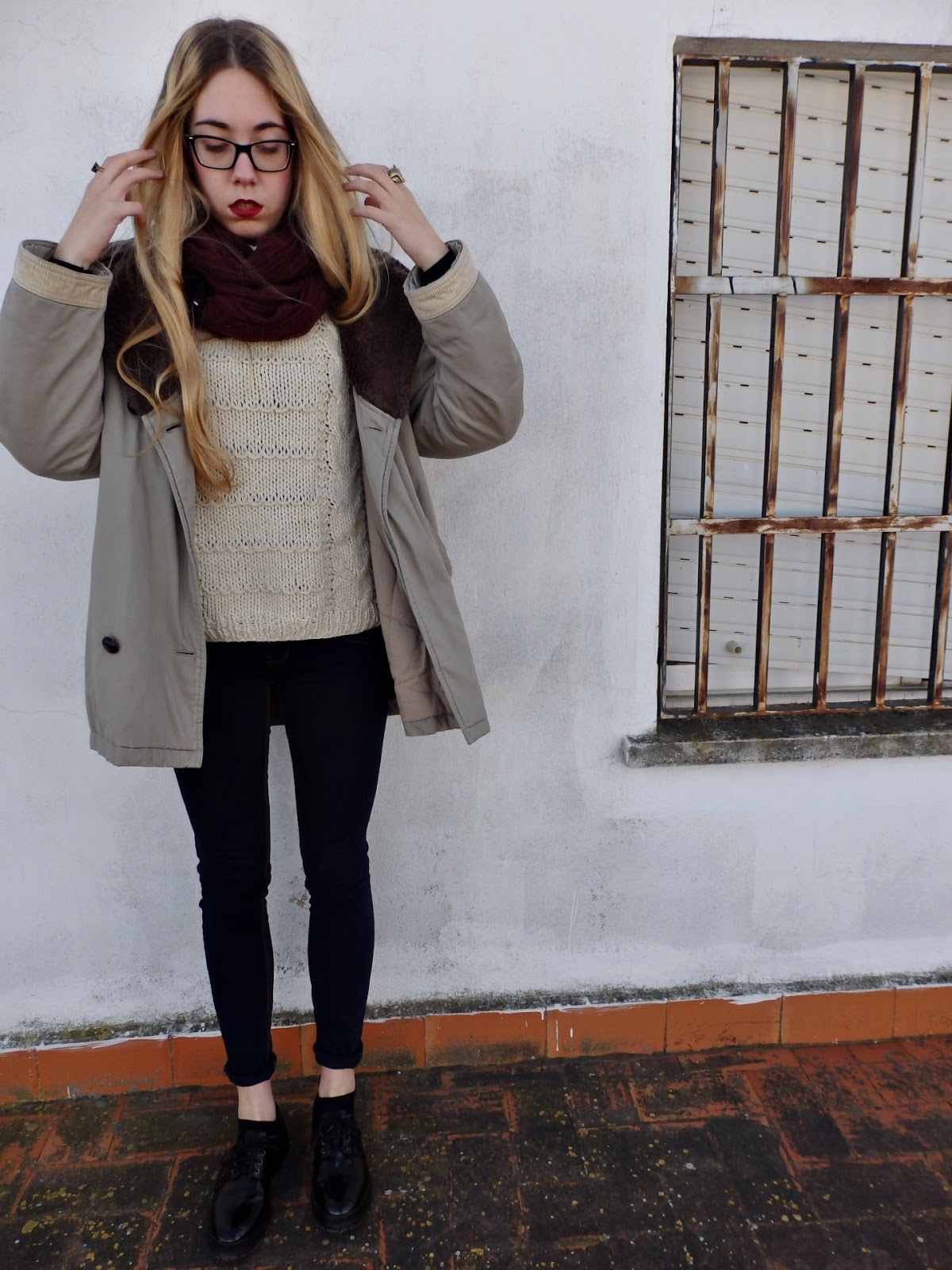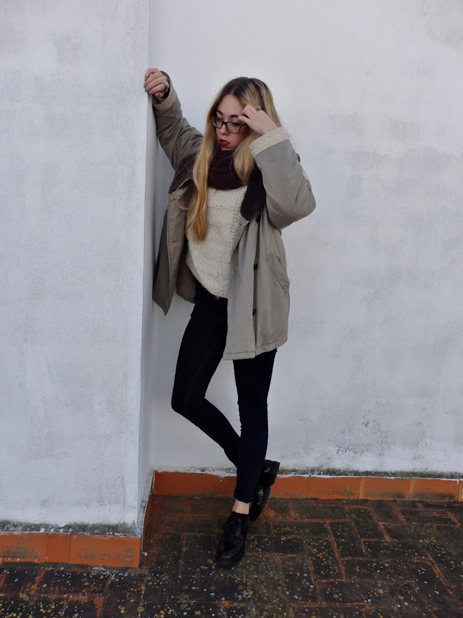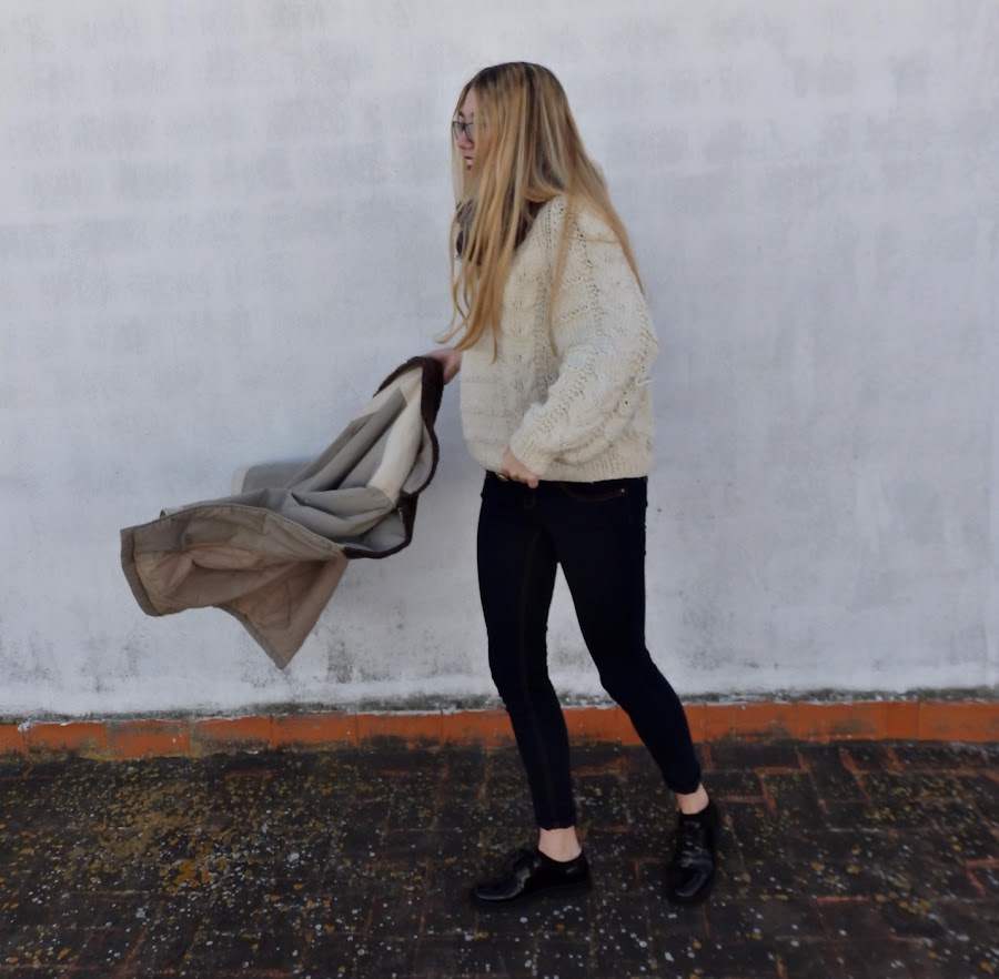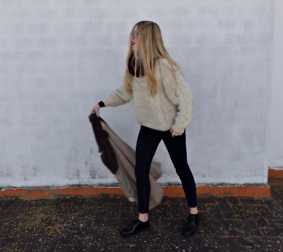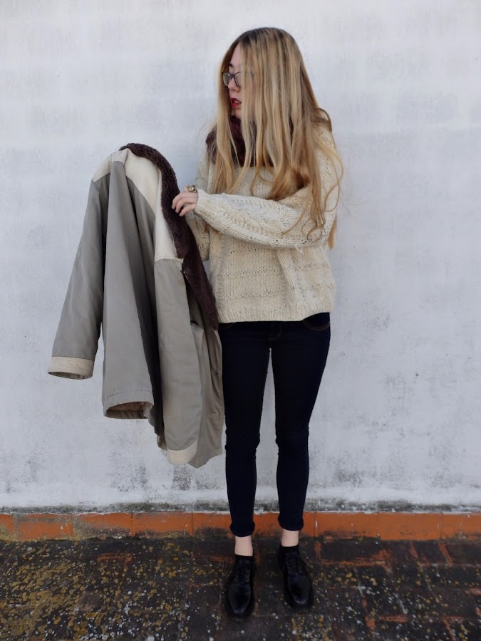 El outfit que enseño hoy, está compuesto por unos vaqueros de tono oscuro, y un jersey de lana color beige. Para complementar este conjunto he escogido un abrigo vintage oversize en tonos amarronados que me encanta la caída que tiene, y un pañuelo granate.