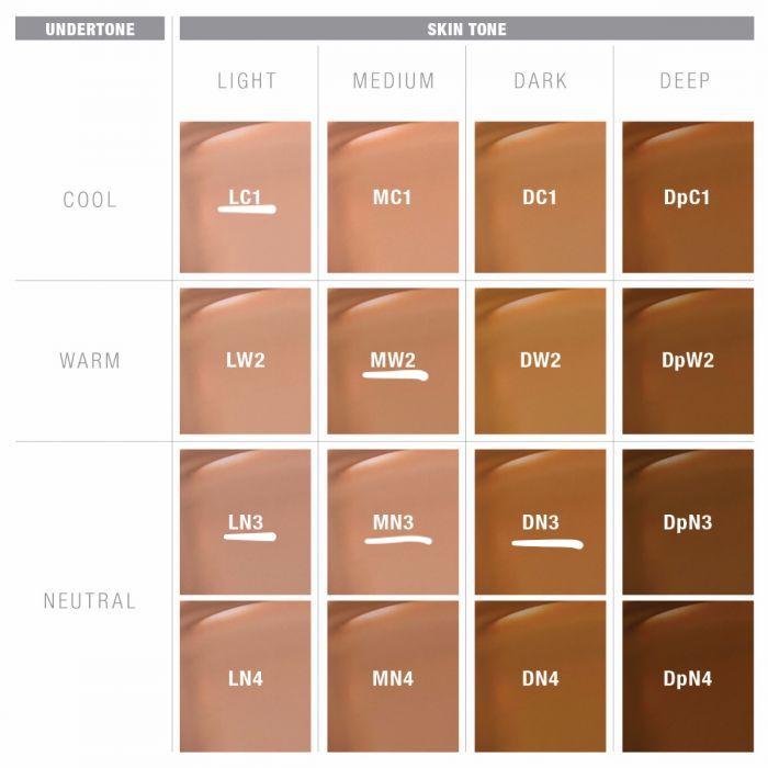 Hay multitud de tonos pero a España sólo nos llegan 5 (los subrayados en la imagen). Pensaréis como yo que es una miseria. Si os consuela, la base tiene tonos que se adaptan bien al tono original de la piel por lo que podéis probar si alguno os funciona.
