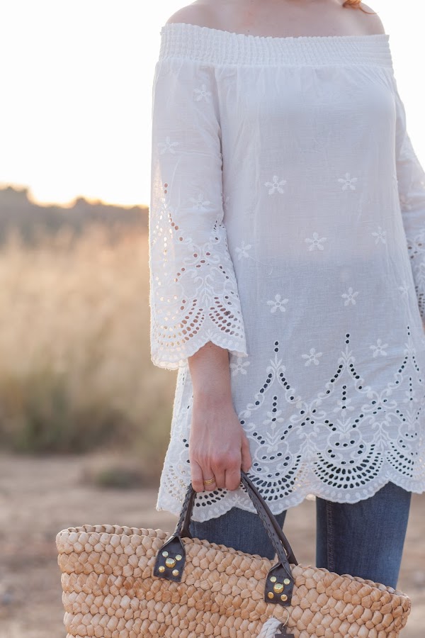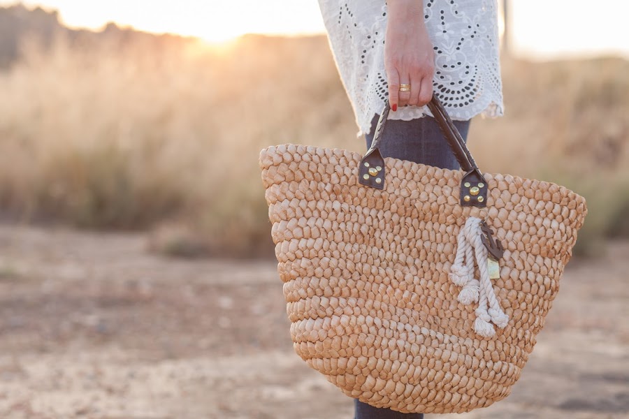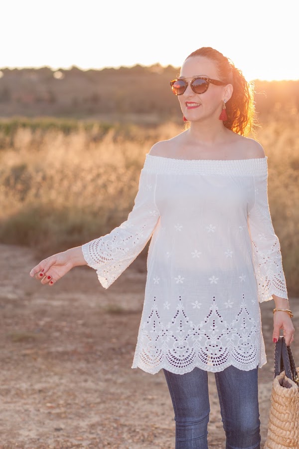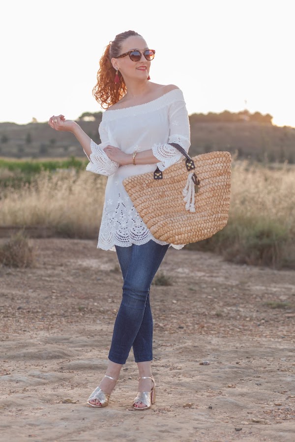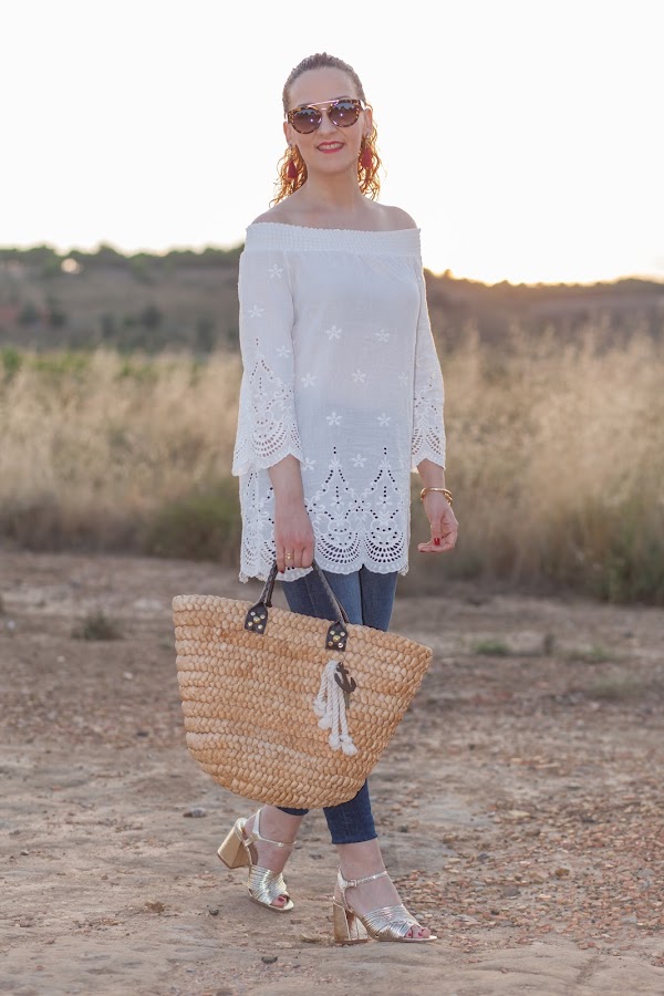 Qué pena que el verano dure tan poco porque está lleno de momentos maravillosos. Uno de ellos son las puestas de sol, me encantan los colores tostados que nos deja cada día. Hace unos días, al plegar de trabajar quedé con mi marido para un plan sencillo pero de 10. Nos cogimos una bolsa de patatas fritas grande, unas Coca Colas y nos fuimos a ver la puesta de sol de las fotos de hoy. Una vez allí aprovechamos e hicimos fotos al look que había llevado aquel día para ir a trabajar: un blusón blanco bordado con los hombros al aire, pitillos azul oscuro blanco y lo combiné con unas sandalias doradas y capazo.