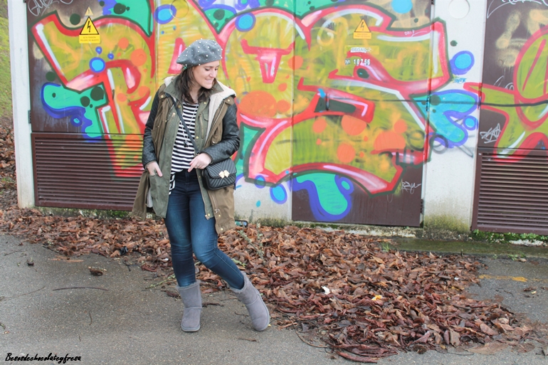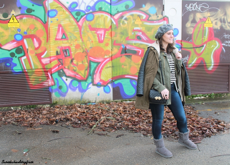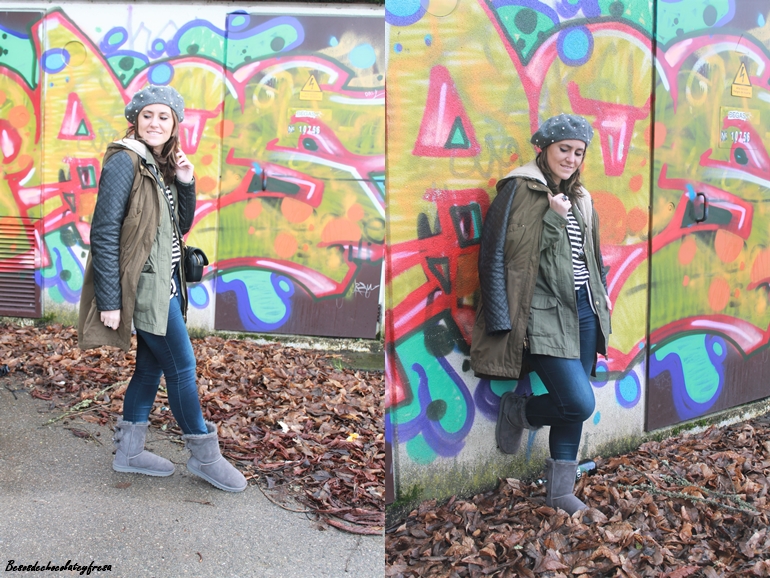 Yo en esta ocasión por dar contraste llevo un look en tonos grises y verde militar junto con estampado a rayas. Otro look a capas pues con el frío que estamos teniendo cuantas más mejor vienen para el cuerpo y así guardar el calor. El toque chic lo aparta la boina con el detalle de las perlitas.