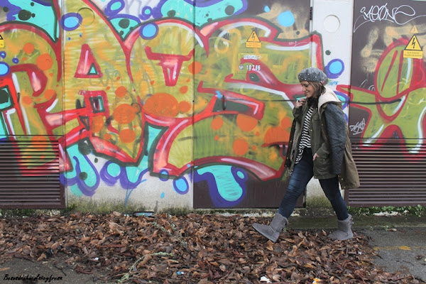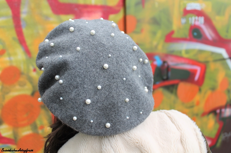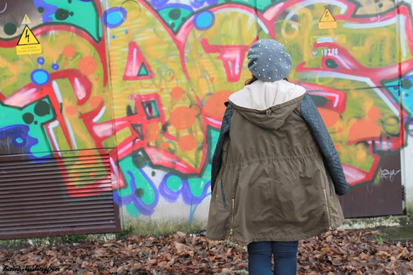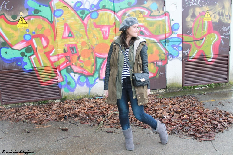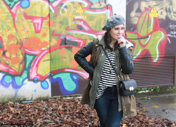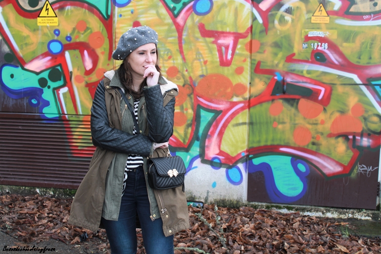 Yo en esta ocasión por dar contraste llevo un look en tonos grises y verde militar junto con estampado a rayas. Otro look a capas pues con el frío que estamos teniendo cuantas más mejor vienen para el cuerpo y así guardar el calor. El toque chic lo aparta la boina con el detalle de las perlitas.