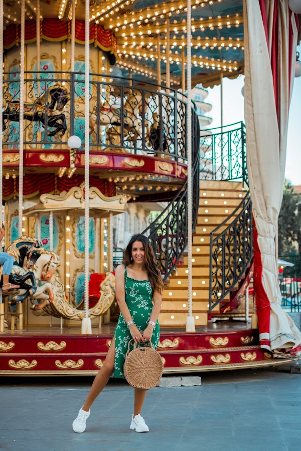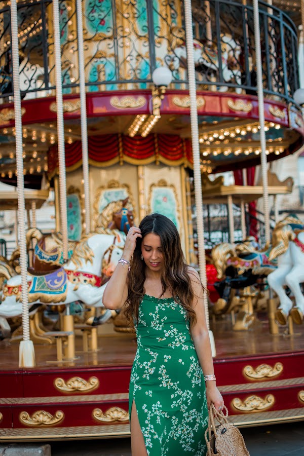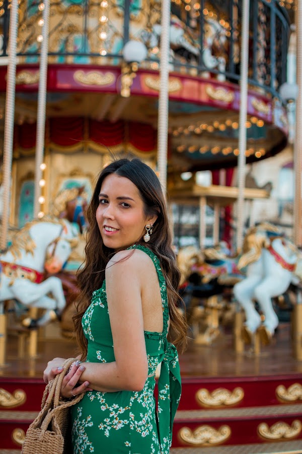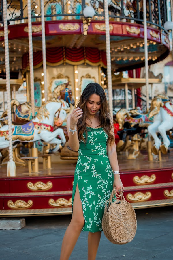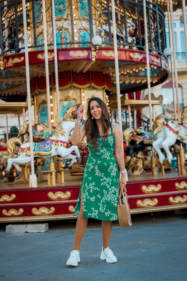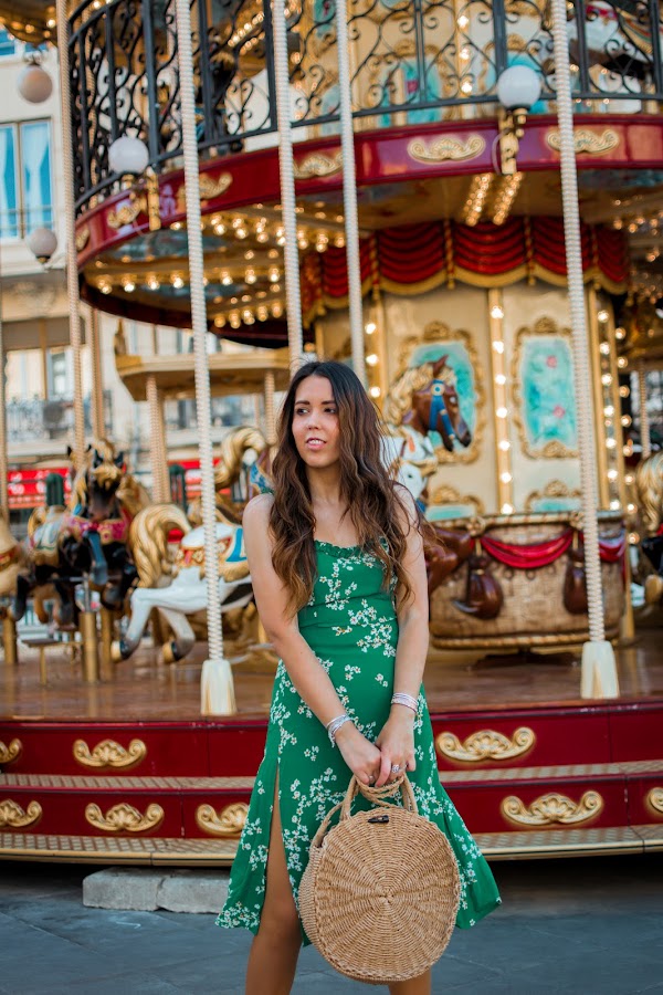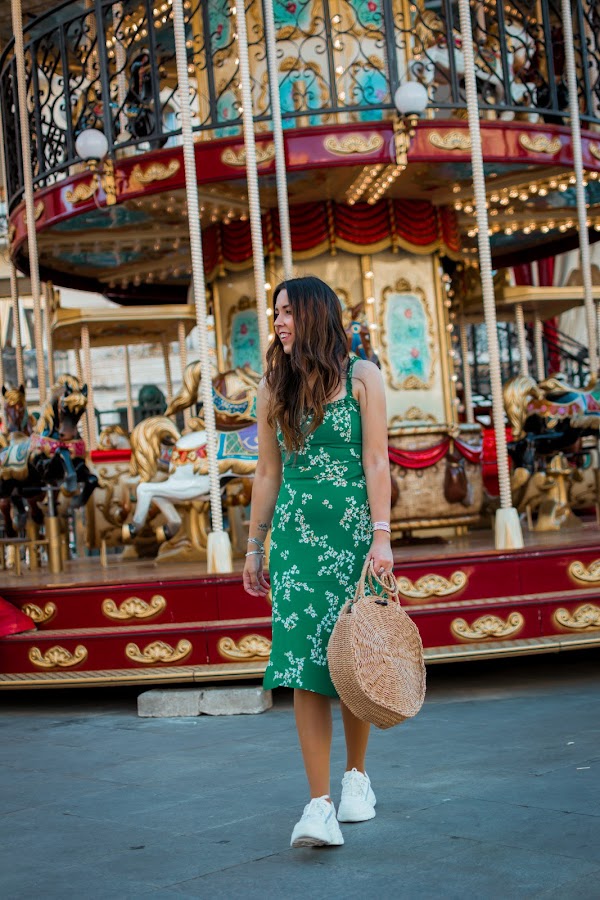 Yo he optado por ellas y así darle un toque más casual al vestido de hoy. Invita totalmente al buen tiempo por su color verde esmeralda, sus flores y el escote en la espalda que se anuda para darle un toque más especial. Tiene un corte perfecto, tanto en el pecho como de largo, justo por debajo de la rodilla. Y lo mejor, el toque sexy de las aberturas que le hacen aún más bonito. Para llevarlo todo, no puede faltar un bolsito, algo informal para seguir en el rollo del look. Están muy de moda y van con todo, este es redondo y se puede llevar tanto de mano como colgado del hombro, una opción genial. Las deportivas blancas bien llamativas y unos pendientes dorados con conchas, completan el outfit de hoy. Tenéis todos los enlaces como siempre, al final del post.