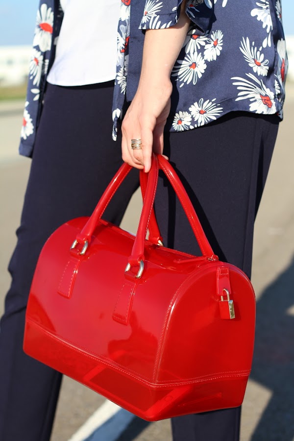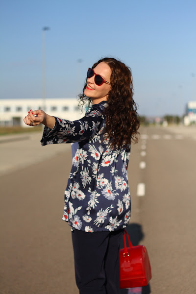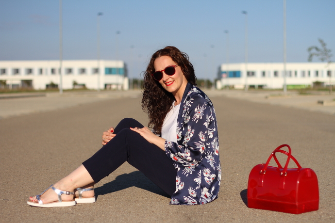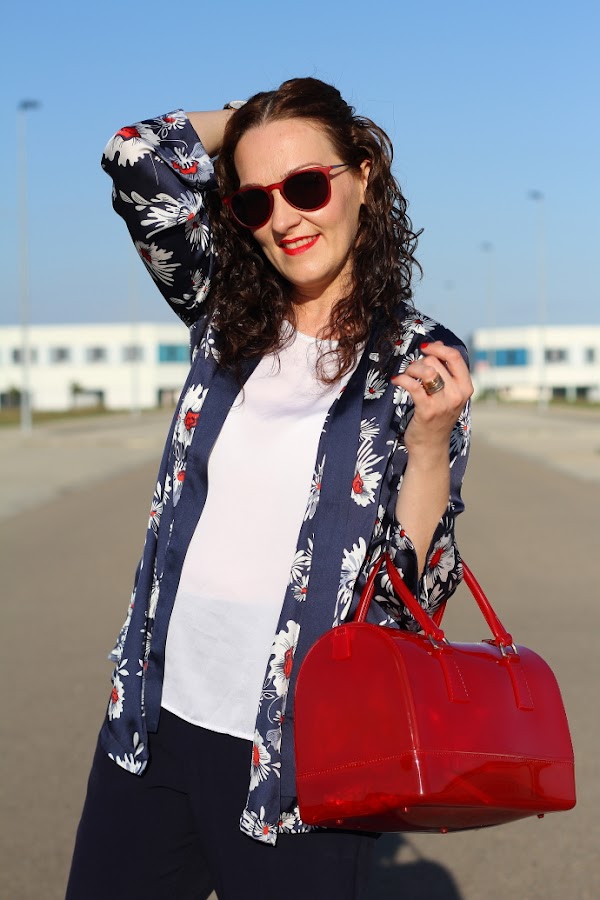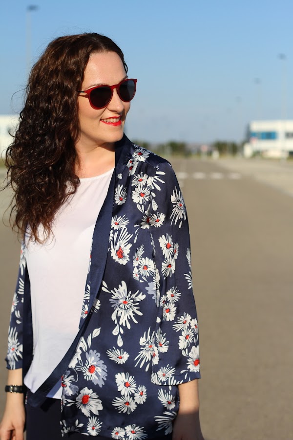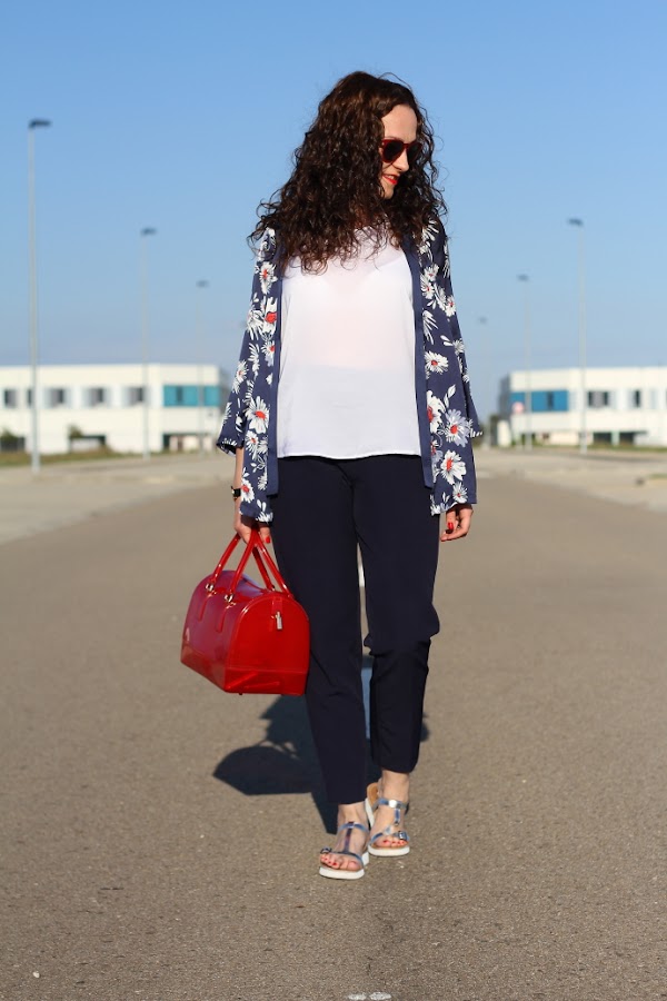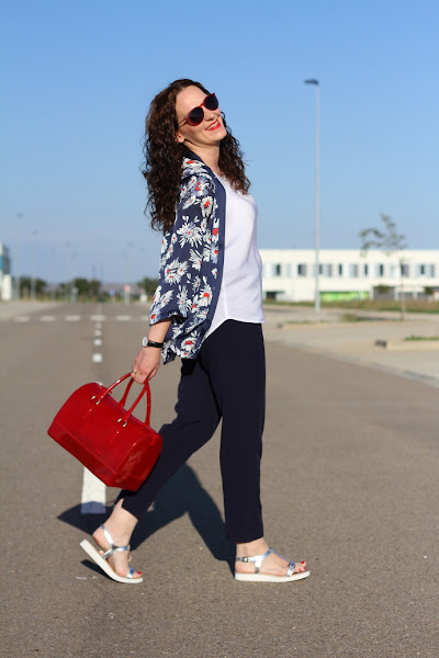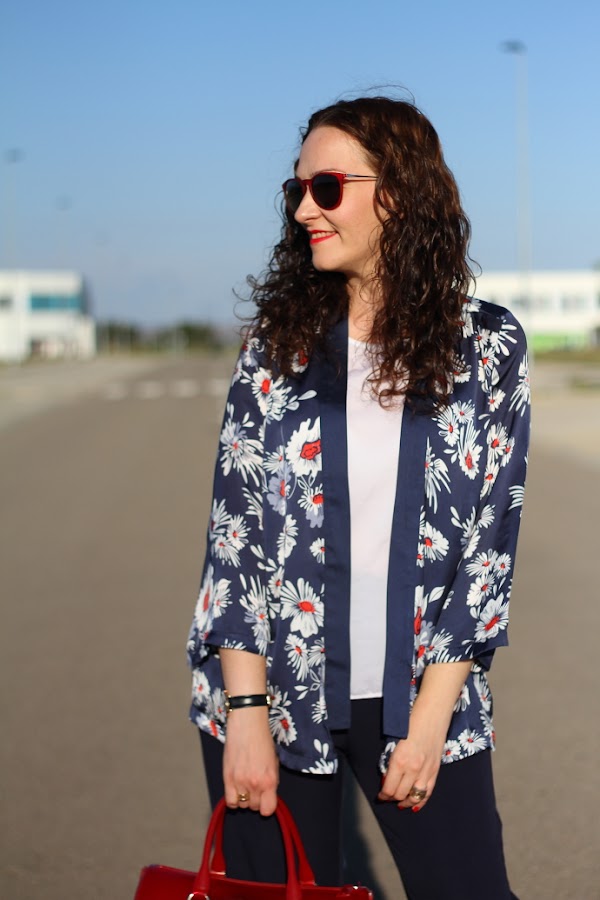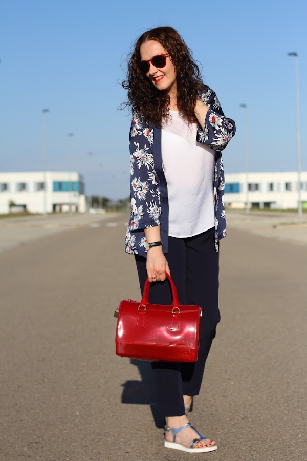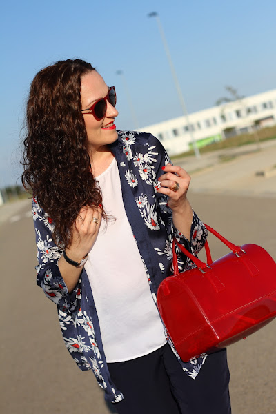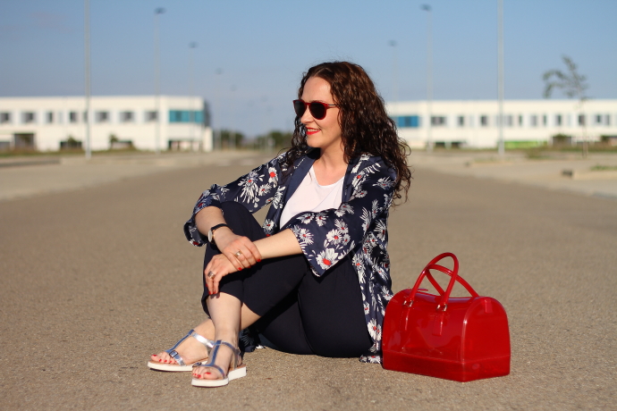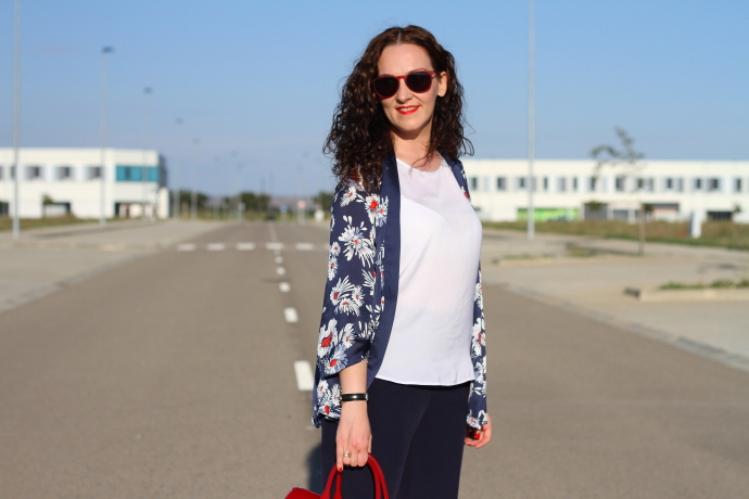 Con la llegada de septiembre las temperaturas han bajado un poquito. Por mi zona durante el día se está bien, es más tenemos días que hasta hace bastante calor, pero tanto a primera como a última hora del día necesitas una manguita fina por encima. Así que poco a poco voy sacando del armario las chaquetas más finas y los kimonos, convirtiéndose estos últimos en mis grandes aliados. Son perfectos para el momento que refresca y al ser más livianos que una chaqueta los puedes seguir llevando durante todo el día. Este día me decanté por montar un look en tonos azules con toques rojos decantándome por un kimono de flores y pantalones capri. Completé el estilismo con un bolso rojo, sandalias plata y pinté mis labios de rojo que es como más me gustan.