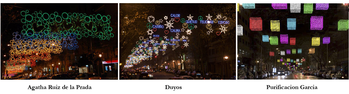 Madrid se llena de luz y arte, con diseños de algunos de los modistos, arquitectos y diseñadores mas relevantes del panorama nacional. Por ejemplo, Ángel Schlesser, en Princesa; Ana Locking, en Jorge Juan; Teresa Sapey, en Velázquez y Montera; Purificación García, en Plaza Mayor y zona centro; Hannibal Laguna, en la calle Mayor; Ben Busche (calle Arenal, Preciados, Carrera de San Jerónimo, calles Hileras, Fuentes, Milaneses, Santiago, Escalinata y Mesón de Paños, Ballesta y alrededores); y Roberto Turégano, en calle Alcalá (tramo de Cibeles a la Puerta de Alcalá) son algunos de ellos. Otros que tambien repiten son Davidelfin, Roberto Torreta, Juanjo Oliva o Amaya Arzuaga.