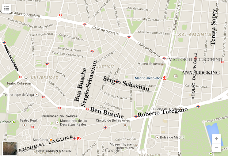 Madrid is full of light and art, with designs from some of the designers and architects more relevant on the national scene. For example, Angel Schlesser, in Princesa street; Ana Locking in Jorge Juan; Teresa Sapey in Velázquez and Montera; Purificacion Garcia, Plaza Mayor and downtown area; Hannibal Laguna, on Main Street; Ben Busche (Calle Arenal, Atlantico, Carrera de San Jerónimo, Fuentes, Milanese, Santiago, Escalinata and Meson de Paños, Ballesta and vicinity); and Roberto Turégano, in Alcalá (section from Cibeles to the Puerta de Alcalá) are some of them. Others who are also repeat are Davidelfin, Roberto Torreta, Juanjo Oliva and Amaya Arzuaga.