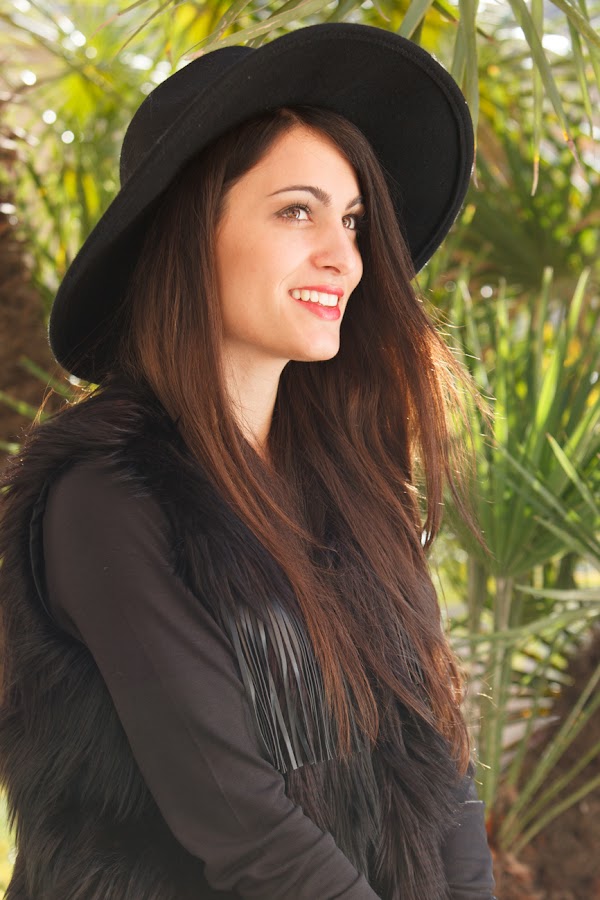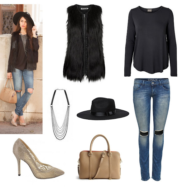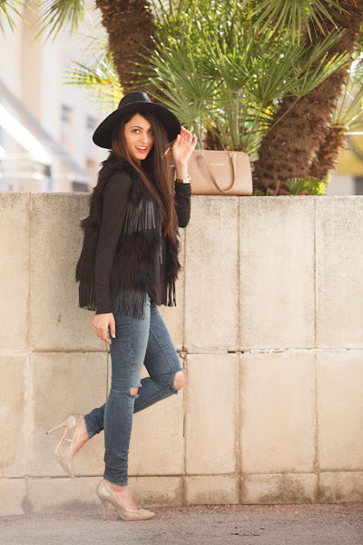 Un año más vuelven los abrigos y chalecos de pelo. En este look os traigo este precioso chaleco combinado con flecos de cuero.