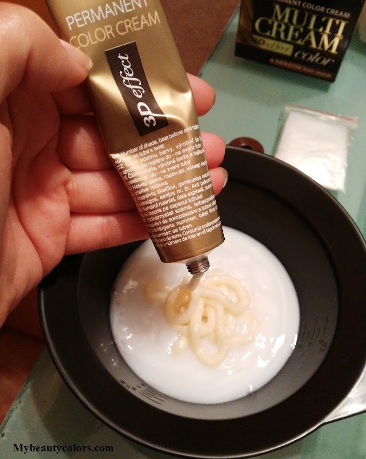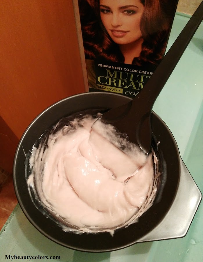 Como podéis comprobar, lleva lo mismo que cualquier tinte de marcas más conocidas, el tubo de color, la crema reveladora, el acondicionador de keratina para después de la aplicación y unos guantes de plástico. En un principio se puede mezclar el color con la crema reveladora en el bote que podéis ver para poder aplicar directamente en las raices del cabello, algo bastante práctico, peeeero, yo os recomiendo que lo mezcléis mejor en una de esas cubetas para tinte. ¿Porque? Pues básicamente porque la crema resultante tiene una consistencia bastante espesa y tienes que apretar mucho el bote para que salga por el agujero, por lo que se hace un poco más engorroso. Yo desde que lo hago así, voy mucho más deprisa y cubro mejor todo el pelo.