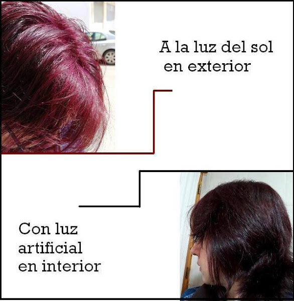 Lo que más me ha llamado la atención es la diferencia de color que se me nota al estar al sol y al estar en interior sin luz natural, al estar en interiores apenas se me nota el color, un ligero tono rojizo oscuro, pero al estar en exterior se me nota muchísimo. En la foto podéis ver el color recién aplicado, en el que se me veía bastante oscuro y a la vez muy teñido incluso casi fucsia.