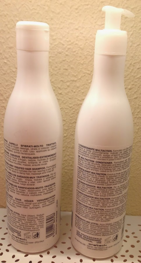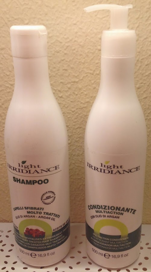 También probé un champú y acondicionar de aceite de argán para cabellos dañados, light Irridiance, que son los siguientes: