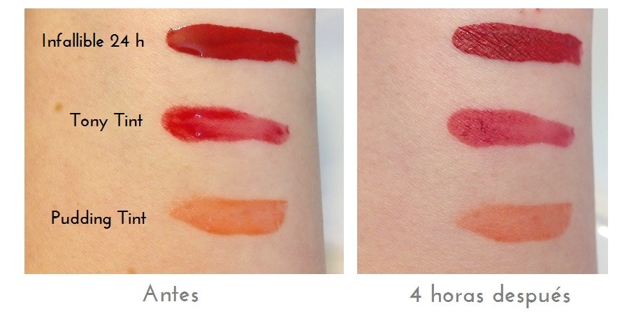 El Pudding Tint es con diferencia mi favorito de los tres, por su textura, el resultado más natural y porque no reseca los labios. Además, no tiene el problema de caerse a trozos que sí tenían los anteriores.Como dato curioso, os contaré que después de hacer los swatches que os enseñaba al principio del post con los tres labiales no los retiré con desmaquillador para ver cuánto duraban. Al día siguiente el Pudding tint había desaparecido, el Tony Tint se seguía notando aunque mucho más leve, mientras que el de LOreal estaba intacto... ¡y se mantuvo así durante tres días! (y sí, me duché, todos ellos)