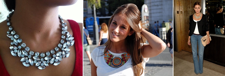 Para un escote redondo con volumen , usar collares cortos o gargantillas pegadas al cuello que ayudan a estilizarlo y para cuellos redondos sin volumen apostar por collares tipo babero.