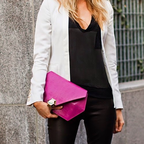 Carteras en tonos fucsia combina con un outfit de negro y blanco que estan muy en tendencia
