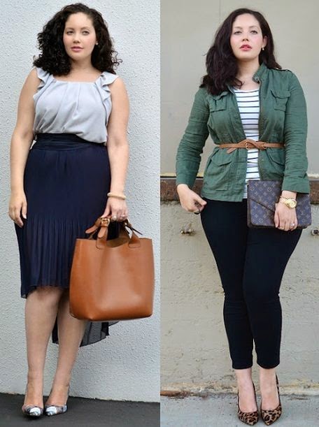 Si somos de contextura gruesa :lo ideal es usar bolsos grandes o carteras tipo sobre como lo vemos en la modelo,otro típ importante si quieres resaltar la cintura y disimular el busto grande ,usa cinturones delgados y usalo debajo del busto .