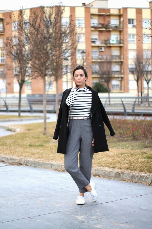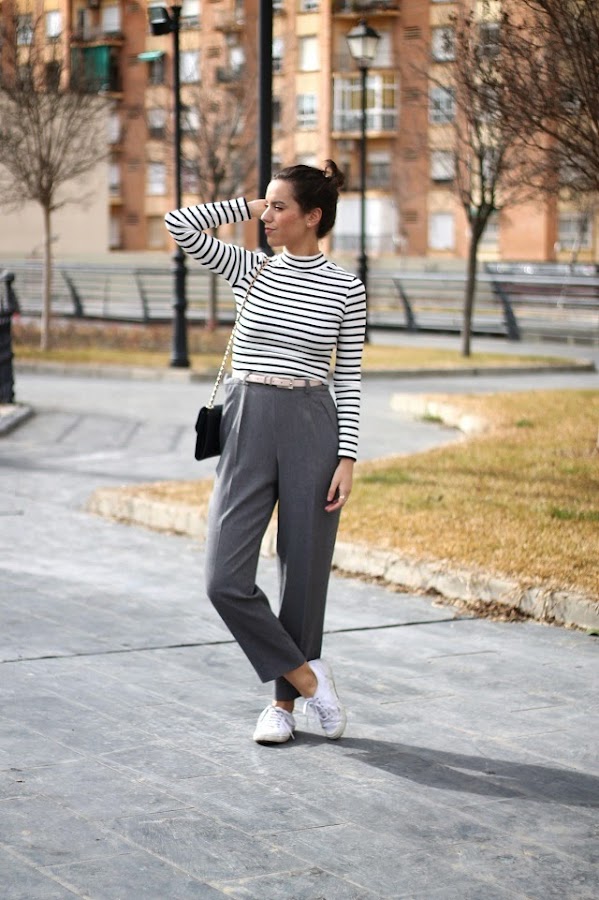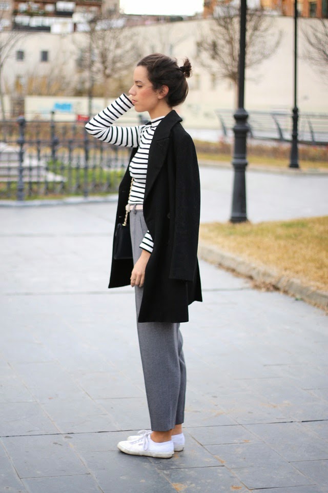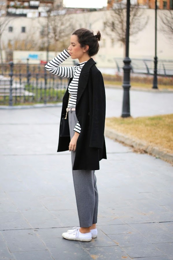 Hoy ha sido uno de esos días que te levantas con ojeras y no se van...jaja. Si, después de algunos días de trabajo fuera de casa, ahora toca recuperar sueño y fuerzas para seguir con la semana. Como no, zapatillas en mis pies, estaba claro! Pantalones muy, pero que muy, muy cómodos, rayitas de mis preferidas, moño, y corre que te corre a trabajar!