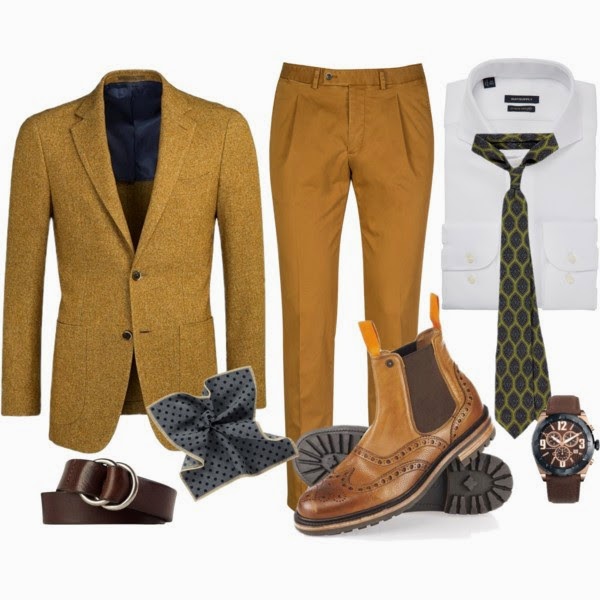Para los chicos tengo un look de mucho color para éste día de otoño soleado. Combinamos el traje color mostaza de Suitsupply con camisa blanca y una corbata de la misma casa con motivos en verde para que haga contraste. Botines color tostado de Superdry y como complementos un cinturón marrón y reloj Viceroy de Joyería Miguel Relojería