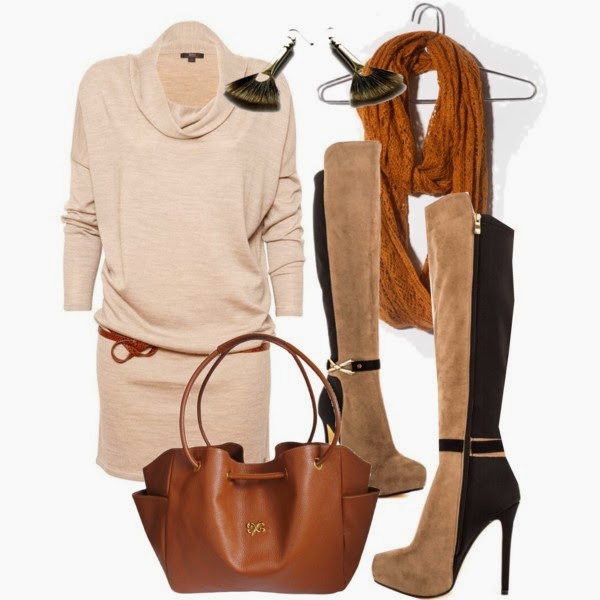 Tenemos un vestido mangas tres cuartos de punto y cuello alto con un cinturón estrecho a la cintura para que nos realze la figura de Zulily en color beige muy claro. Botas de tacón alto de aguja en color beige con negro de Dresswe y como complementos una bufanda de color tostado de Stradivarius y un bolso en color tostado más oscuro de Boticca. Y ése toque único de originalidad con los pendientes de Oh! de Gamme en forma de pequeñas brochas de maquillaje