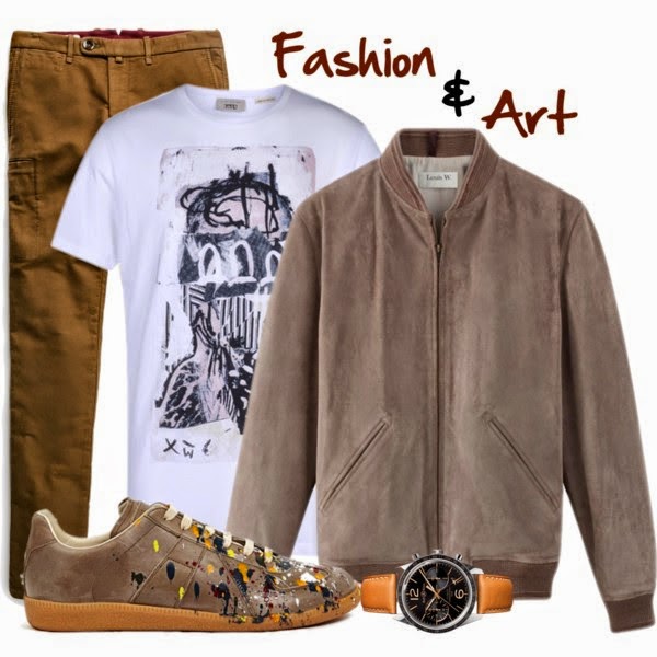 Para un domingo lluvioso, se me ha ocurrido una mezcla de arte y moda informal y bastante casual con deportivas en color marrón claro salpicada de pintura de  Maison Martin Margiela, una camiseta blanca estampada con un motivo abstracto de  Marc Jacobs Intl,tejanos marrones de H.E. by Mango,reloj con correa beige de  Bell & Ross y una chaqueta bomber en color taupe Louis W. APC