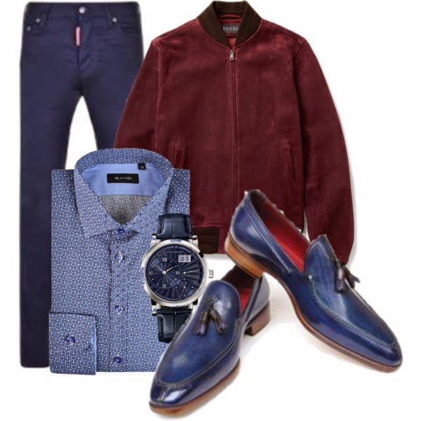 Para este domingo tan soleado te propongo combinarlo en diferentes tonos y darle más color con una chaqueta de color rojo vino con cremallera de Gucci y mocasines con borlas de Paul Parkman en azul. Pantalón azul intenso de Dsquared2 y camisa azul con pequeños detalles florales de Sand. El toque elegante se lo das con un reloj azul marino de A. Lange & Söhne.