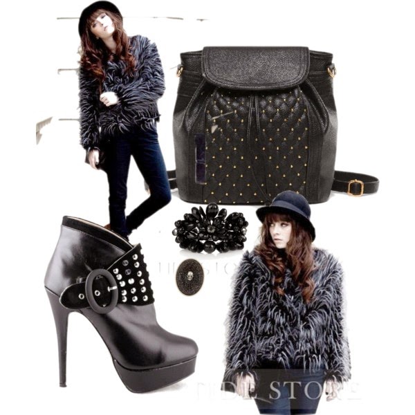 Abrigo de pelos en negro con gris (54,49$) y mochila negra (24,29$) de Tidestore, botines de tacón (93,82â?¬) en Dresswe. Como accesorios un anillo grande en Nordstrom con detalle en calavera (12,97$) para seguir el estilo cañero de los botines y una pulsera negra de Coast (18£)