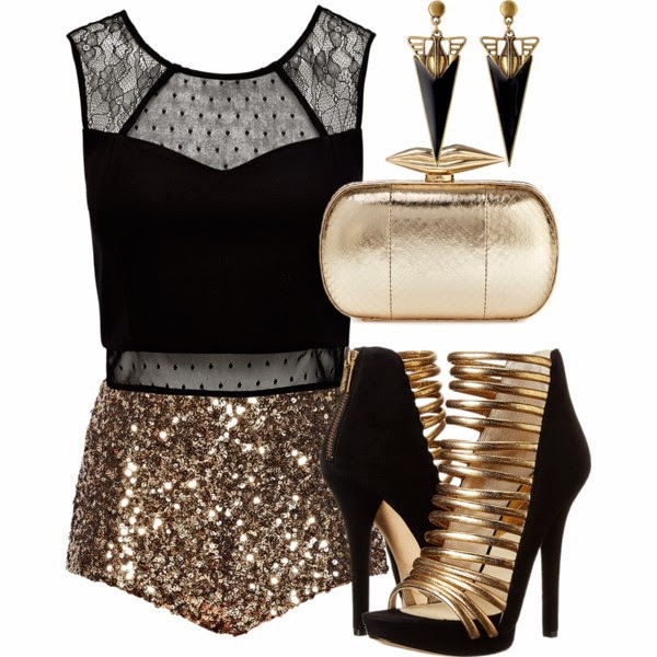Un look de estrella, sexy, en dorado con negro para arrasar !! con mini short de lentejuelas en dorado de John Lewis, top negro con tull de Forever New, sandalias de tacón alto de Zappos en dorado y negro con un clutch en dorado de Gilt. Pendientes en forma de triángulos de Pilgrim en Amazon también en negro y dorado.