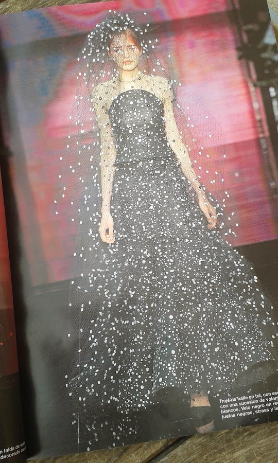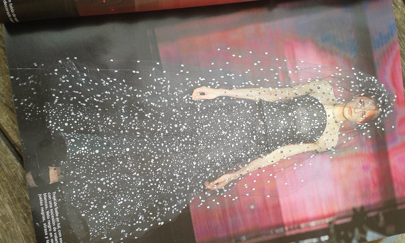 Traje de baile palabra de honor.El bustier está completamente bordado con cuvettes, strass, perlas y azabache. La falda de volantes fruncidos, se ha recubierto con capas en tull y rejilla.
