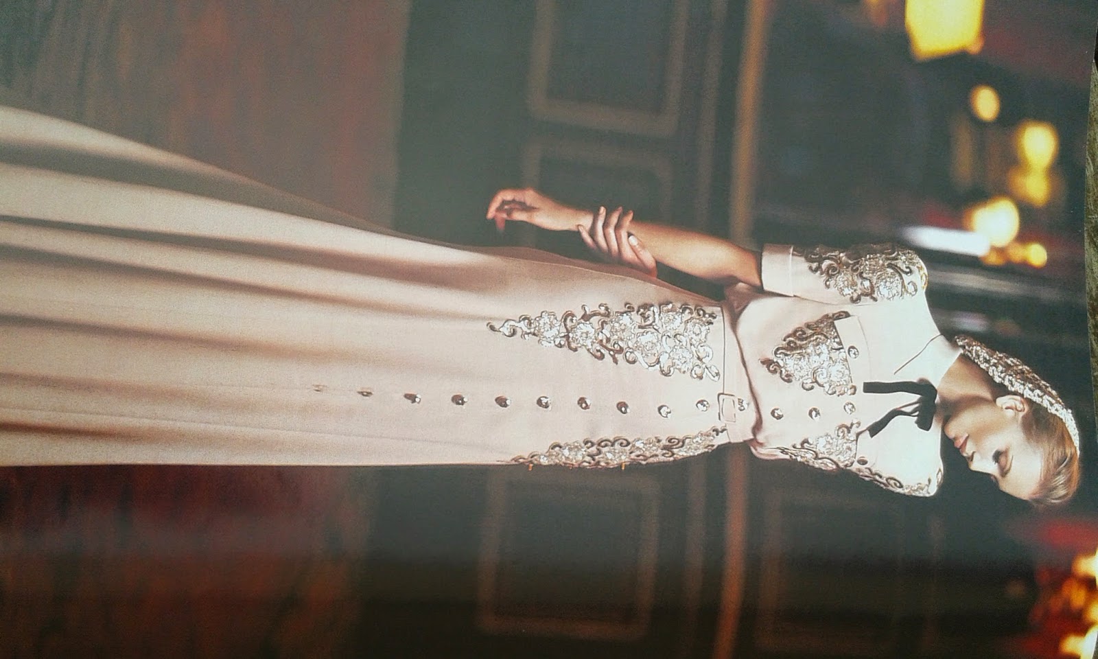Traje de baile en organza azul turquesa, de talle alto, bordado con lazos de organza en color lavanda, pailletes, cristales e hilos de seda. Mangas tres cuartos en tul bordado.