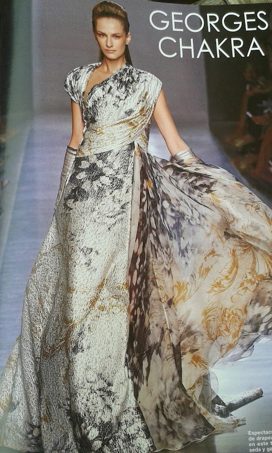Combinación de drapeados y asimetrías en seda y gasa,estampado en ocre y sepia con un motivo inspirado en la naturaleza