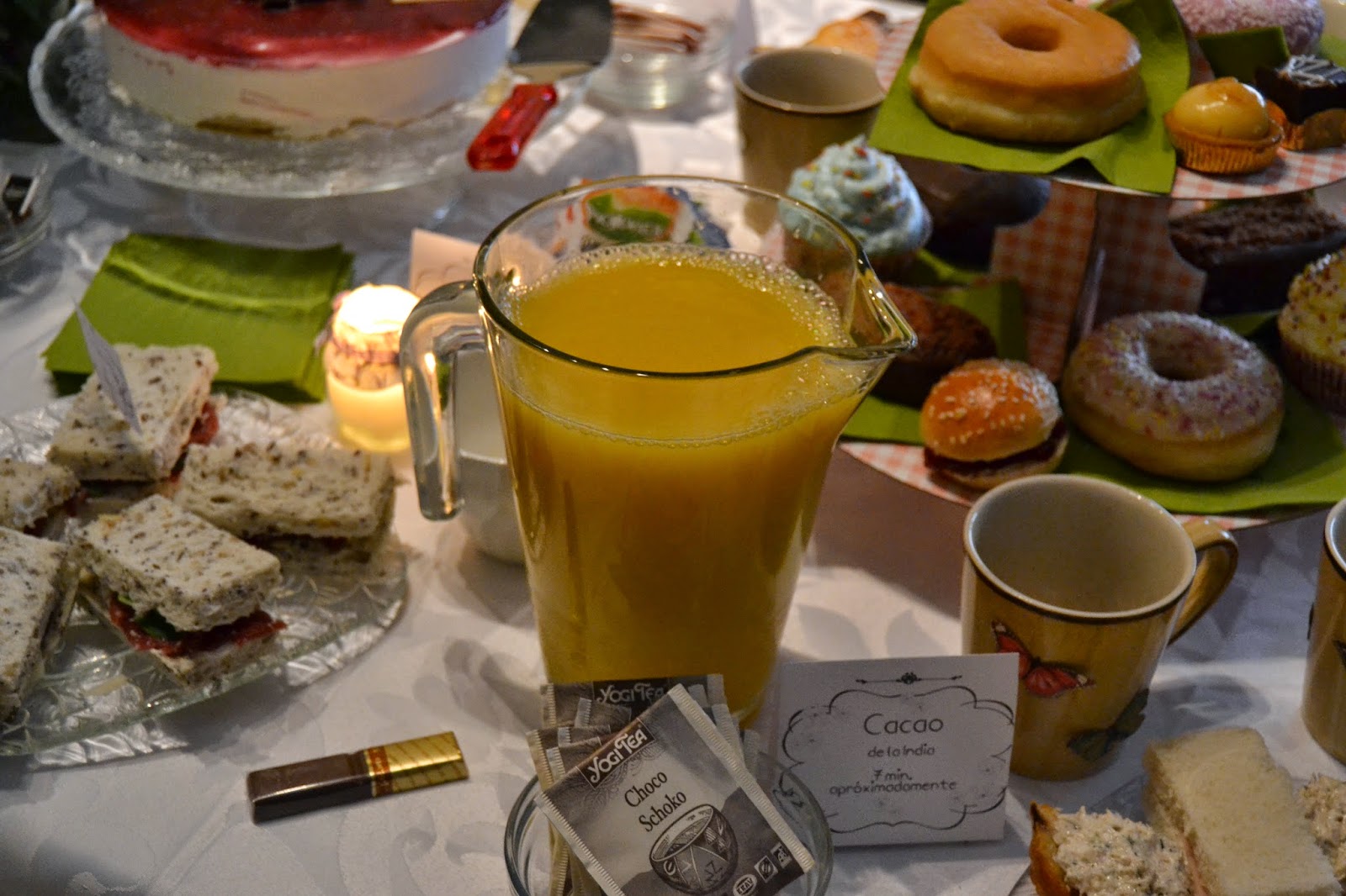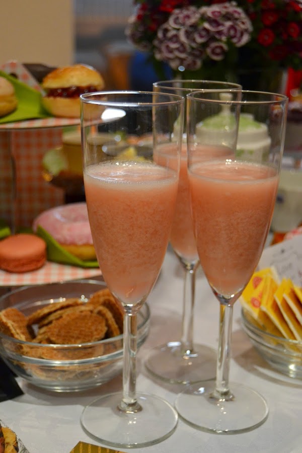Al principio de la velada, se brinda con un vino espumoso y zumos naturales, luego se sigue con el té para acompañar los dulces y aperitivos. Yo hice el brindis con un "mar de cava",utilizando la variante de cava rosada (champagne rosado).