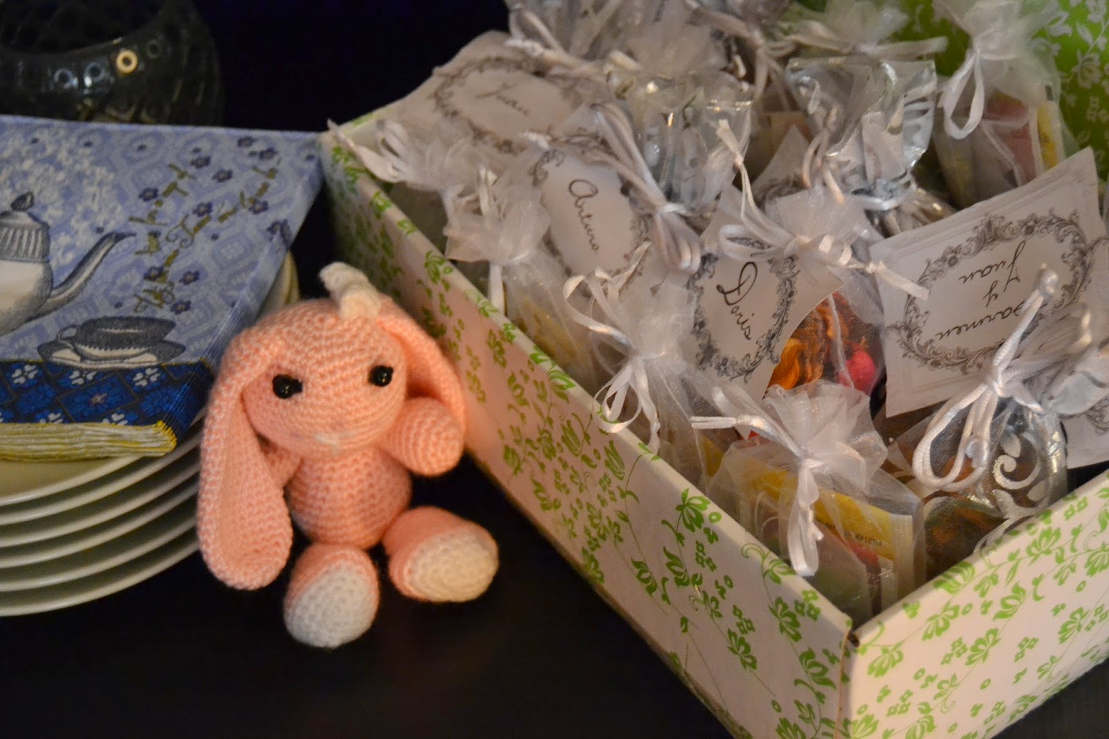 De pequeño recuerdo, obsequié unas mini bolsas de seda con saché, y otras con una pequeña selección de los té de la fiesta. Le acompaña en la foto, un pequeño conejo rosado que me obsequió Mi pequeño atelier, hacen verdaderas bellezas de manualidades en trapillo.