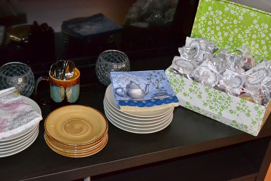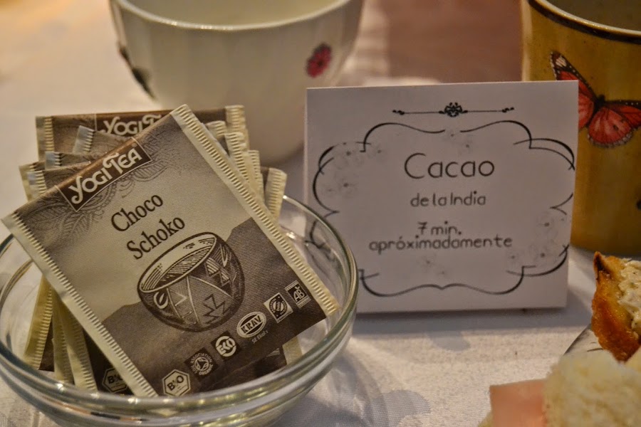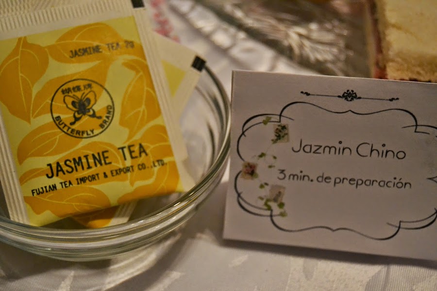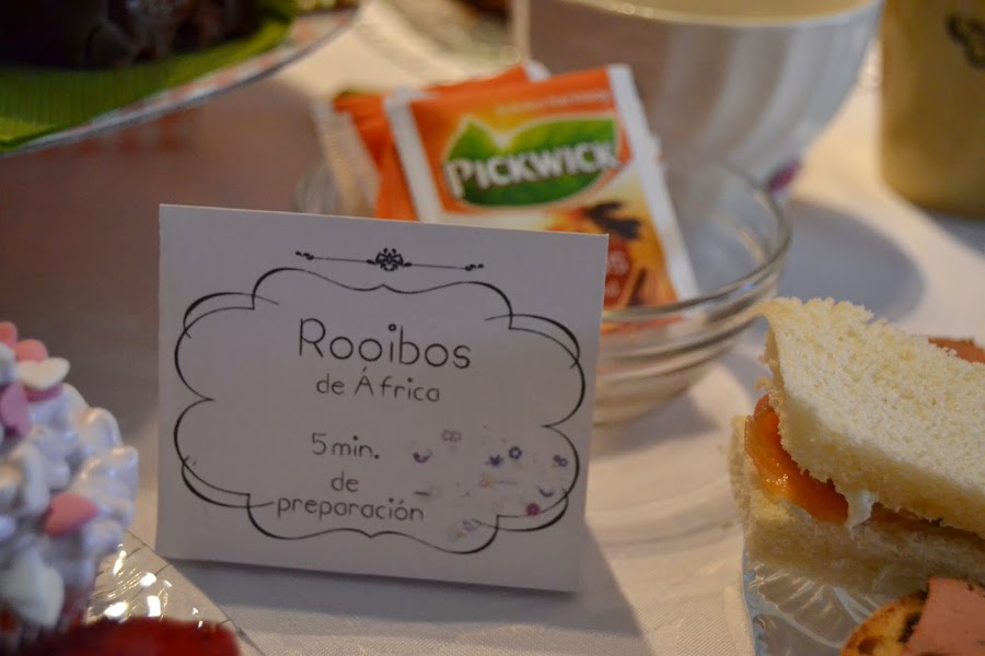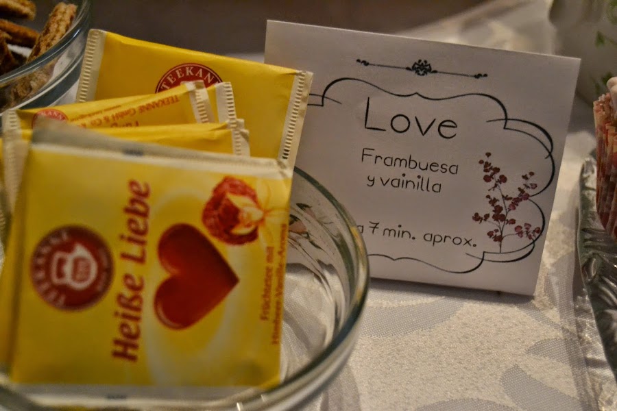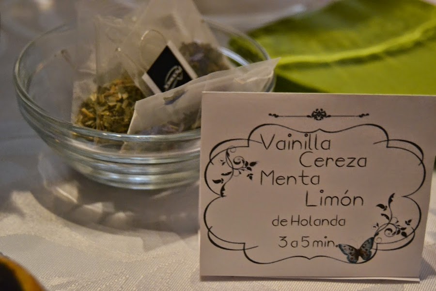 A cada uno los identifiqué con unos pequeños carteles, explicando el sabor, su orígen y el tiempo necesario que debía estar en el agua para que no se amargara. Y coloqué una tetera con agua caliente para que cada uno se sirviera el té de su gusto.