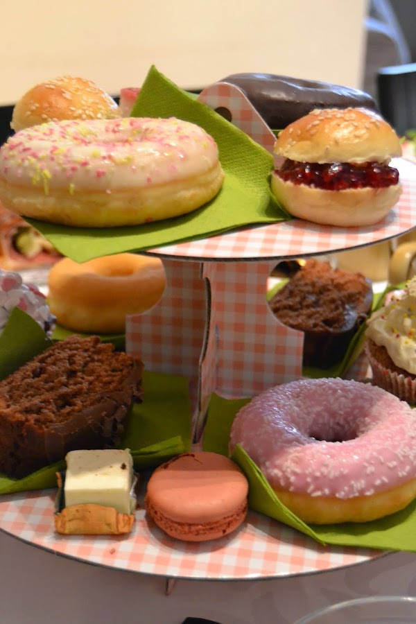 En dulces, tiré la casa por la ventana ! Pequeños dulces de fresa, limón, nata, chocolate, macarrons, donuts de diferentes sabores, leonisas de nata y trufa, galletas de té de Holanda, galletas After Eight, bombones de chocolate, fresas con nata, cup cakes, bizcocho de chocolate en trozos pequeños, mini hamburguesas de mermelada de frambuesa y más!