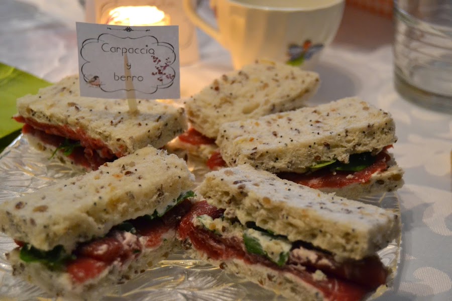 Los acompañé con mini sandwiches de Salmón, Atún, Carpaccio, jamón Dulce y pechuga de Pavo, identificados con sus pequeños carteles. En el siguiente link les dejo la página de donde saqué las recetas: Recetas mini sandwiches.