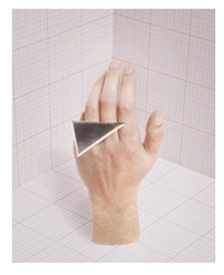 Sus diseños: La escuadra, el transportador, el escalímetro y un nivel, puestos sobre un anillo de plata