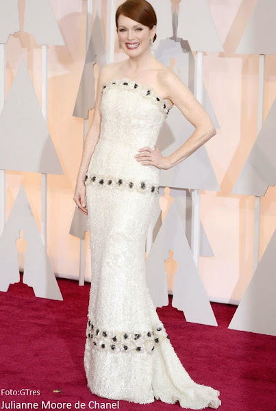 Julianne Moore con vestido blanco de Chanel y detalles en negro en forma de franja. Joyas de Chopard