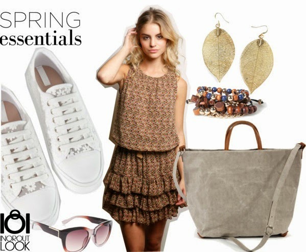 Mini vestido marrón de El Jardín de Manuela, deportivas blancas,set de pulseras y gafas de sol de Stradivarius, tote bag gris de Le Sorelle y pendientes en forma de hojas de Pink Ice