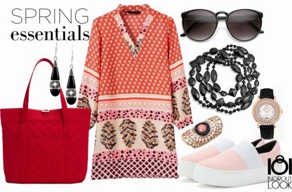 Vestido floral de Romwe, sneakers de Opening Ceremony, tote bag rojo de Vera Bradley, collar negro en Amazon. Reloj de correa negra y esfera de oro rosa de Gemorie, anillo de Yoins, pendientes de Jewel y gafas de sol en ZeroUV